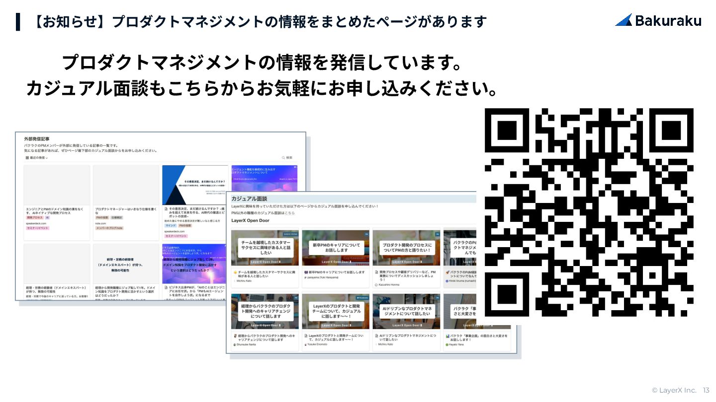 © LayerX Inc. 13 【お知らせ】プロダクトマネジメントの情報をまとめたページがあります プロダクトマネジメントの情報を発信しています。 カジュアル⾯談もこちらからお気軽にお申し込みください。 経理‧労務の経験者 (ドメインエキスパート)が持つ、 無限の可能性