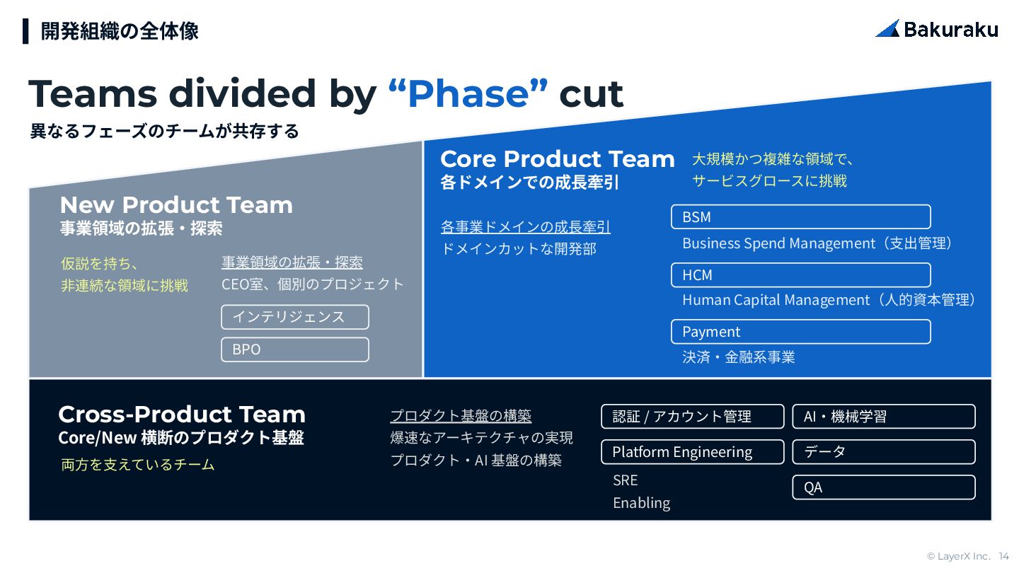 © LayerX Inc. 14 開発組織の全体像 異なるフェーズのチームが共存する Teams divided by “Phase”
