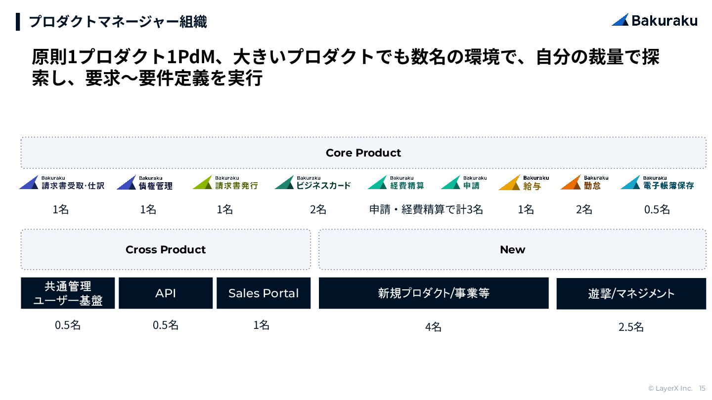 2名 申請‧経費精算で計3名 1名 2名 0.5名 Core Product Cross Product 共通管理 ユーザー基盤 API 0.5名 0.5名 Sales Portal 1名 New 新規プロダクト/事業等 4名 遊撃/マネジメント 2.5名