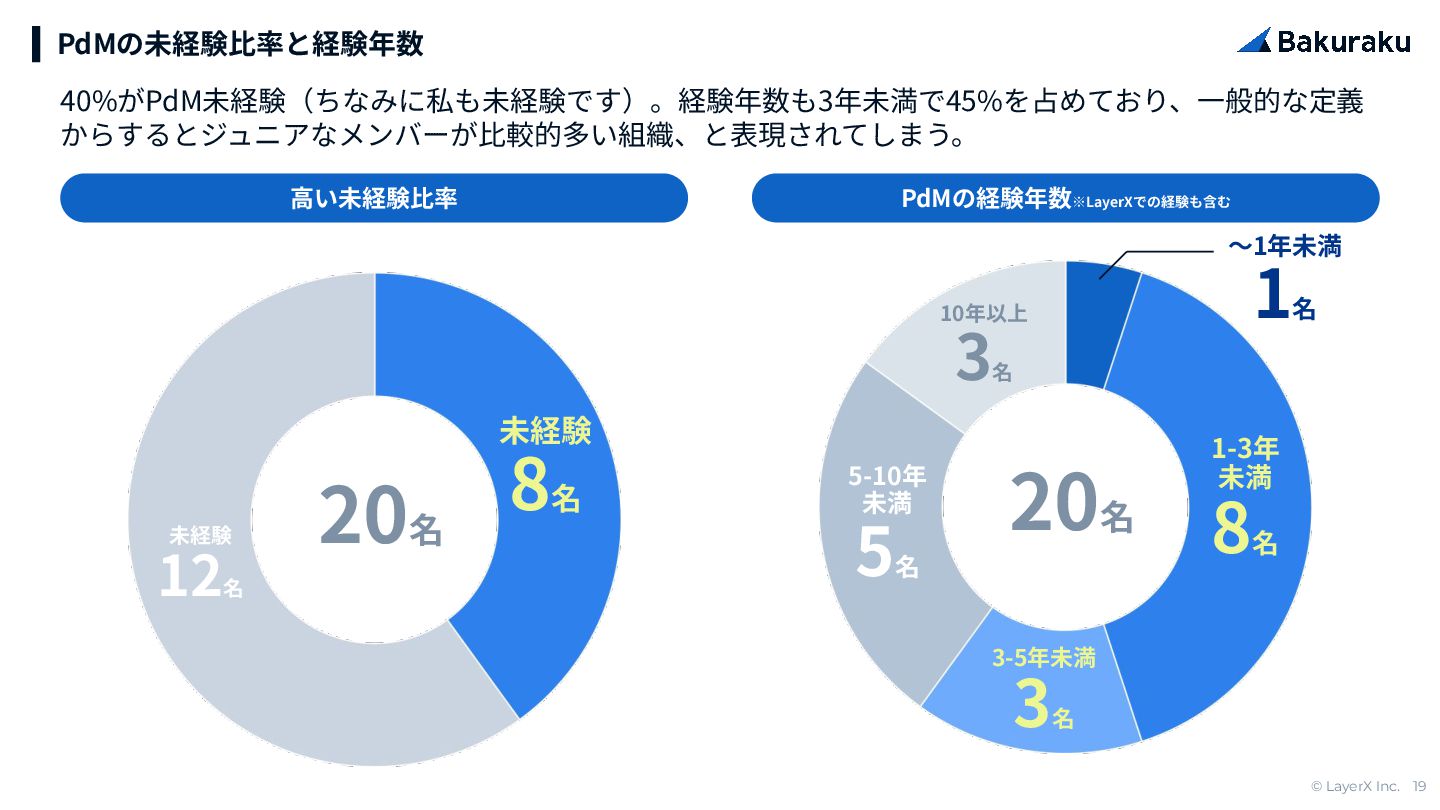 © LayerX Inc. 19 PdMの未経験⽐率と経験年数 ⾼い未経験⽐率 PdMの経験年数※LayerXでの経験も含む 40%がPdM未経験(ちなみに私も未経験です)。経験年数も3年未満で45%を占めており、⼀般的な定義 からするとジュニアなメンバーが⽐較的多い組織、と表現されてしまう。 未経験
