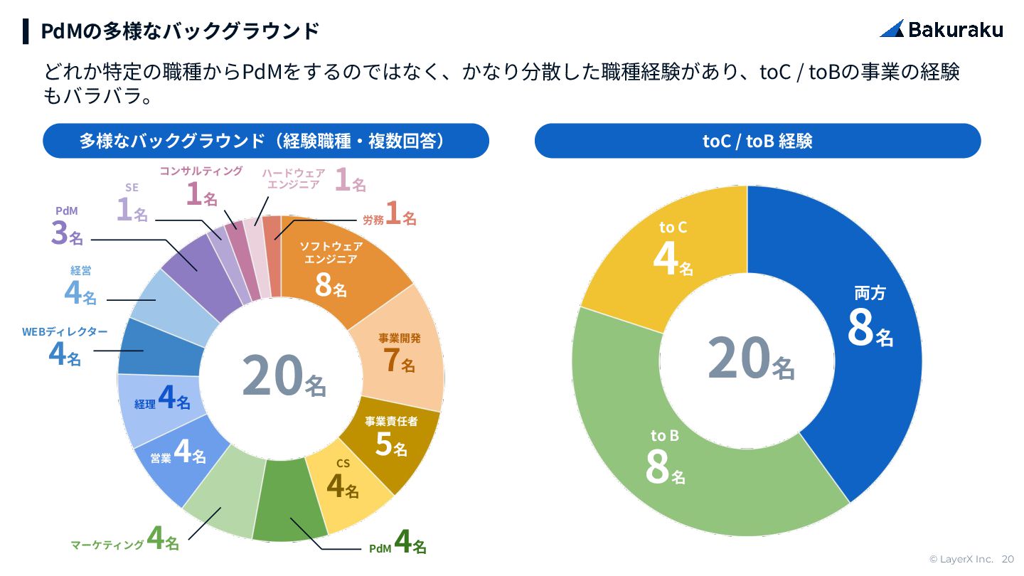 toC / toB 経験 ソフトウェア エンジニア 8名 事業開発 7名 事業責任者 5名 CS 4名 PdM 4名 マーケティング 4名 営業 4名 経理 4名 WEBディレクター 4名 経営 4名 PdM 3名 SE 1名 コンサルティング 1名 ハードウェア エンジニア 1名 労務 1名 20名 両⽅ 8名 to B 8名 to C 4名 20名