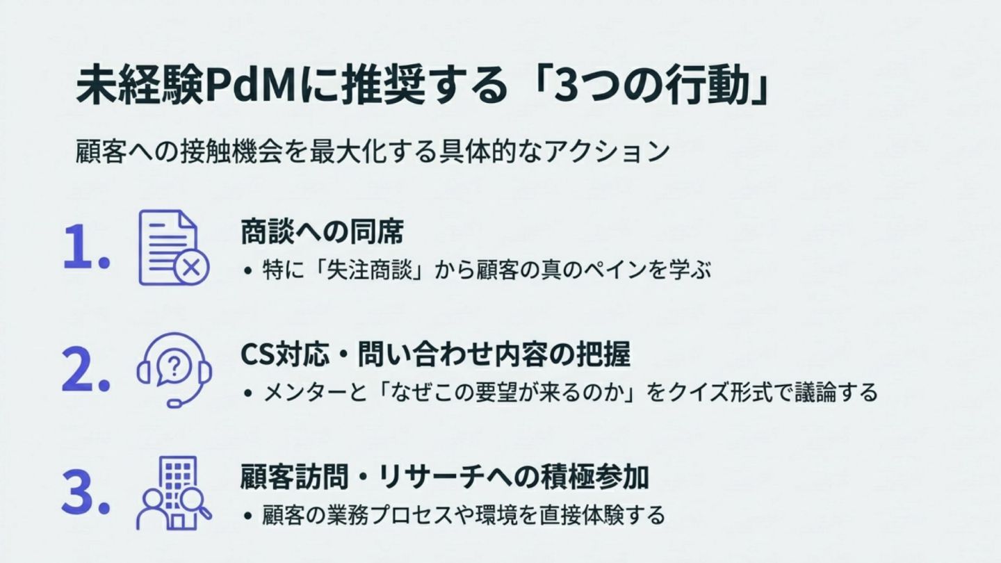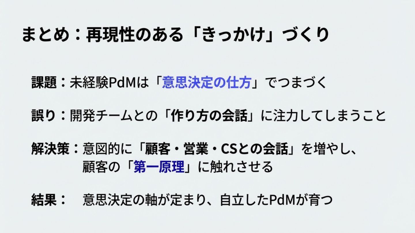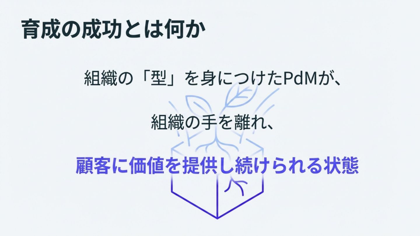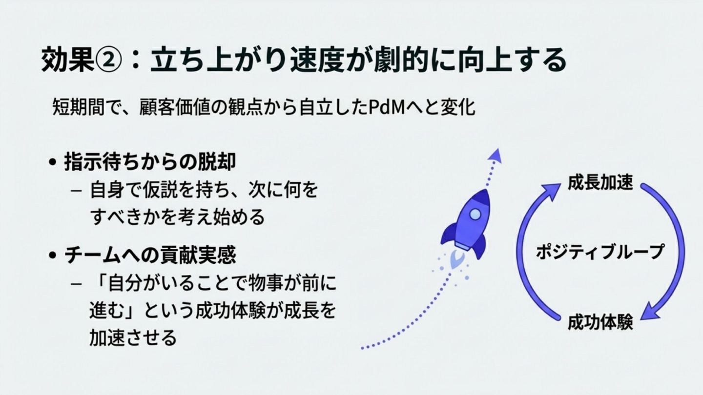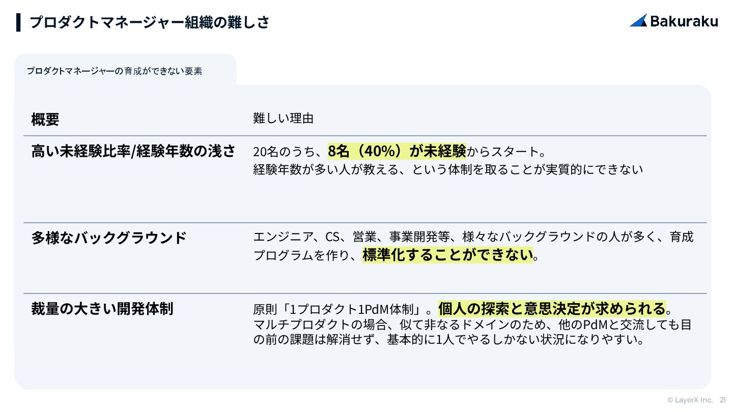 多様なバックグラウンド エンジニア、CS、営業、事業開発等、様々なバックグラウンドの⼈が多く、育成 プログラムを作り、標準化することができない。 裁量の⼤きい開発体制 原則「1プロダクト1PdM体制」。個⼈の探索と意思決定が求められる。 マルチプロダクトの場合、似て⾮なるドメインのため、他のPdMと交流しても⽬ の前の課題は解消せず、基本的に1⼈でやるしかない状況になりやすい。 プロダクトマネージャーの育成ができない要素