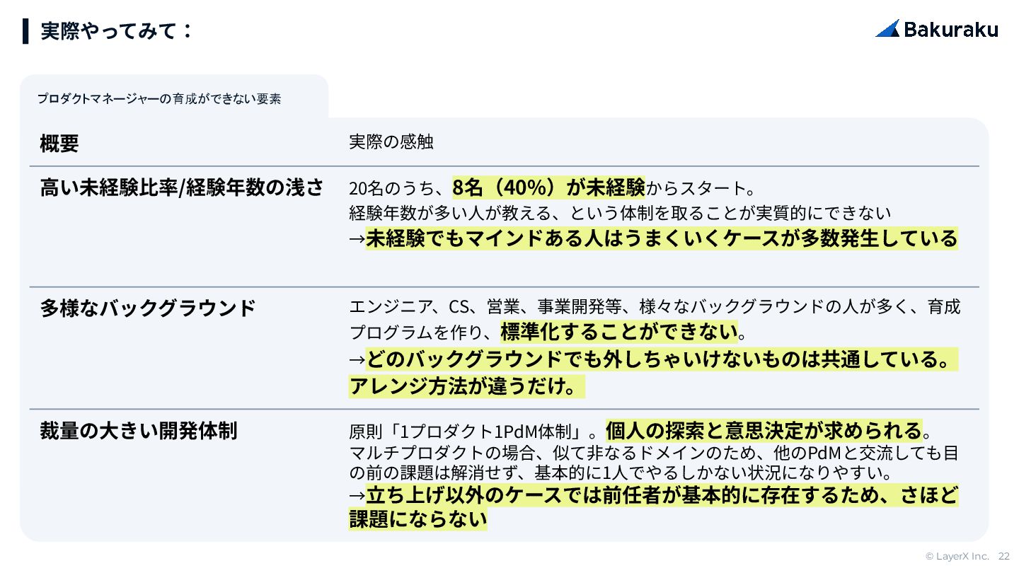 © LayerX Inc. 21 プロダクトマネージャー組織の難しさ 概要 難しい理由 ⾼い未経験⽐率/経験年数の浅さ 20名のうち、8名(40%)が未経験からスタート。 経験年数が多い⼈が教える、という体制を取ることが実質的にできない