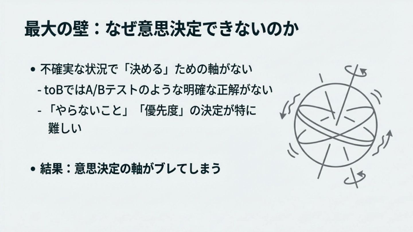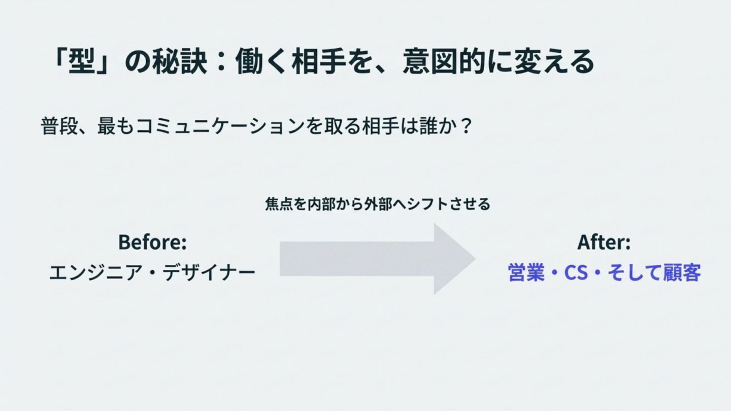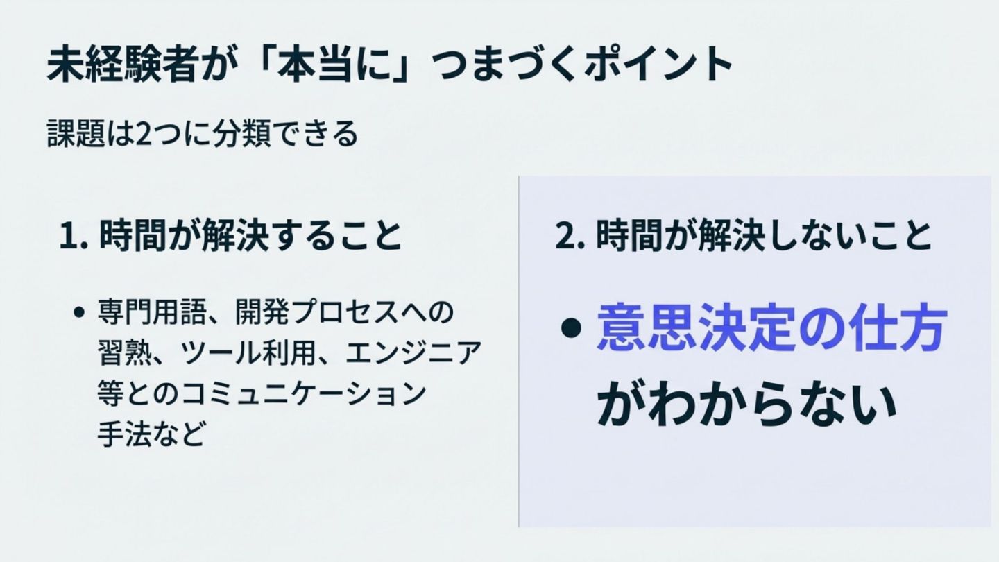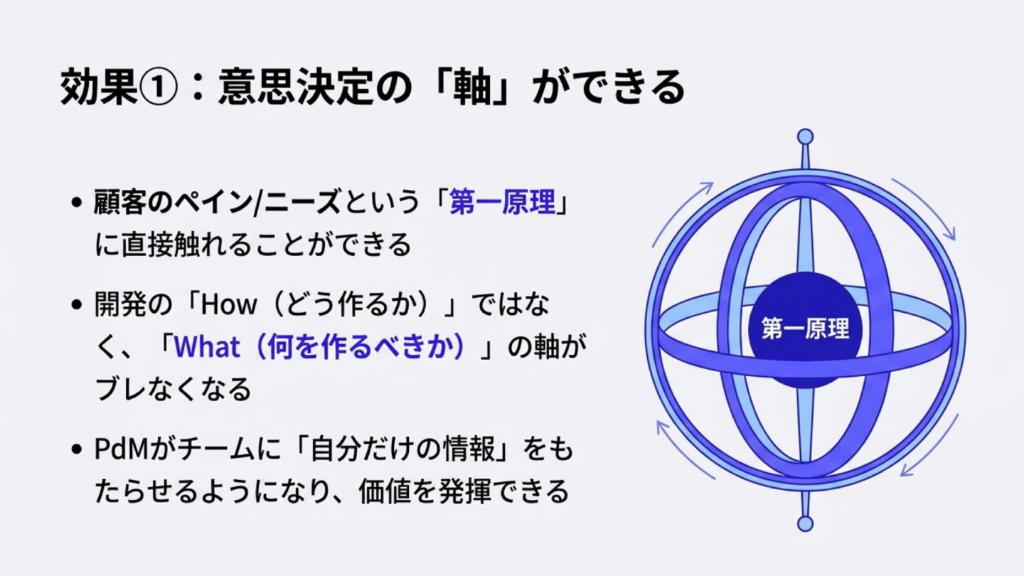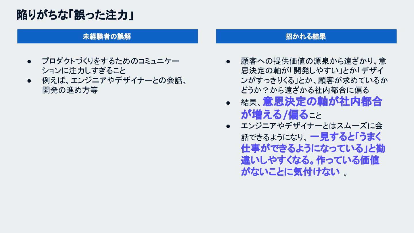 • 例えば、エンジニアやデザイナーとの会話、 開発の進め方等 • 顧客への提供価値の源泉から遠ざかり、意 思決定の軸が「開発しやすい」とか「デザイ ンがすっきりくる」とか、顧客が求めているか どうか?から遠ざかる社内都合に偏る • 結果、意思決定の軸が社内都合 が増える/偏ること • エンジニアやデザイナーとはスムーズに会 話できるようになり、 一見すると「うまく 仕事ができるようになっている」と勘 違いしやすくなる。作っている価値 がないことに気付けない 。 陥りがちな「誤った注力」
