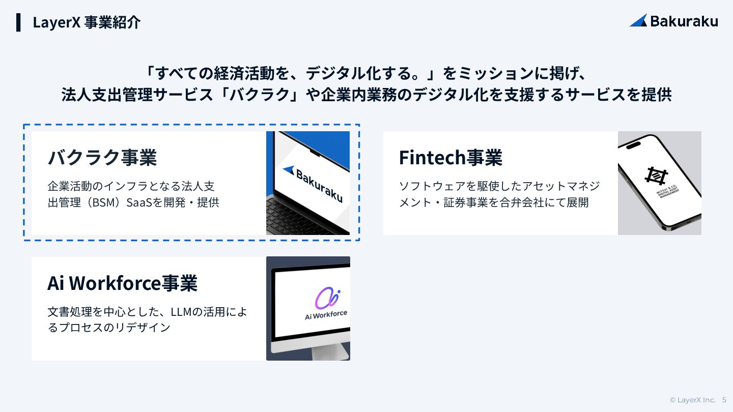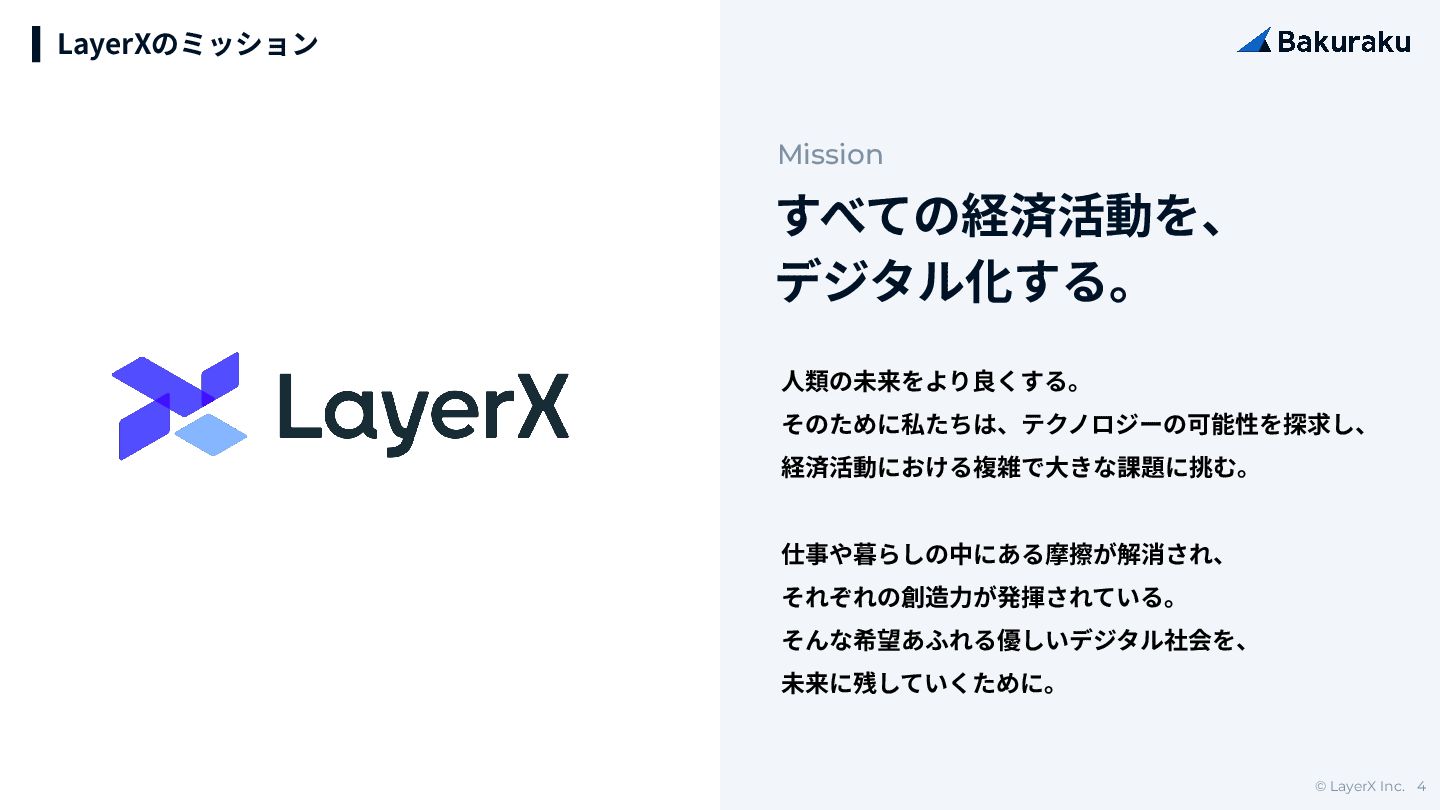 © LayerX Inc. 4 LayerXのミッション すべての経済活動を、 デジタル化する。 Mission ⼈類の未来をより良くする。 そのために私たちは、テクノロジーの可能性を探求し、