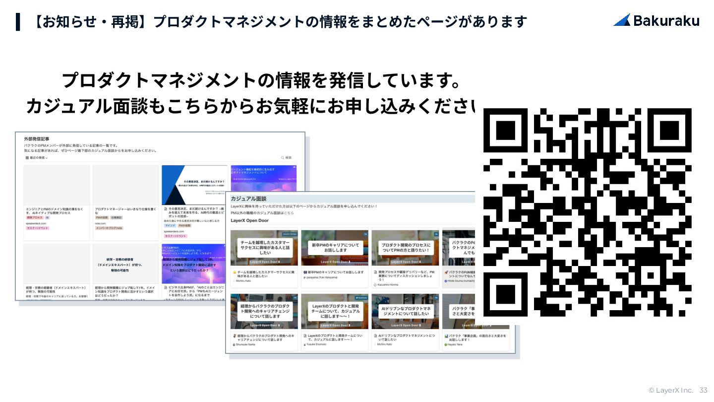 © LayerX Inc. 33 【お知らせ‧再掲】プロダクトマネジメントの情報をまとめたページがあります プロダクトマネジメントの情報を発信しています。 カジュアル⾯談もこちらからお気軽にお申し込みください。 経理‧労務の経験者 (ドメインエキスパート)が持つ、 無限の可能性