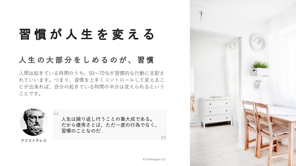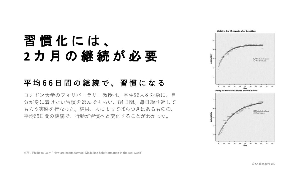 変 わ る マッコリ―大学の心理学者ミーガン・オートンは、運動不足の男女24 人に2ヶ月間ジム通いを続けてもらう実験を行った。すると、ジム通 いの習慣化によってセルフコントロール能力が高くなり、アルコール の摂取量の減少や、衝動買いをなくすなどの習慣がみにつきやすく なったという。 あ る 習 慣 が 身 に つ け ば 、 他 の 習 慣 も 身 に つ く 出所:Megan Oaten, Ken Cheng ” Longitudinal gains in self-regulation from regular physical exercise.”