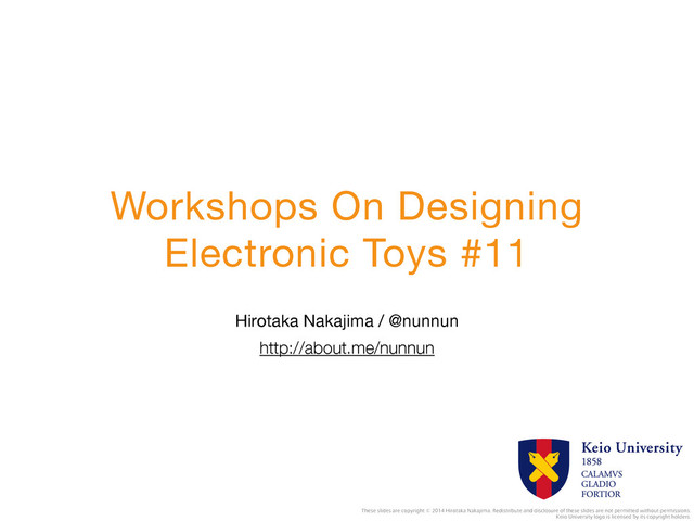 5IFTFTMJEFTBSFDPQZSJHIU)JSPUBLB/BLBKJNB3FEJTUSJCVUFBOEEJTDMPTVSFPGUIFTFTMJEFTBSFOPUQFSNJUUFEXJUIPVUQFSNJTTJPOT ,FJP6OJWFSTJUZMPHPJTMJDFOTFECZJUTDPQZSJHIUIPMEFST Workshops On Designing Electronic Toys #11 Hirotaka Nakajima