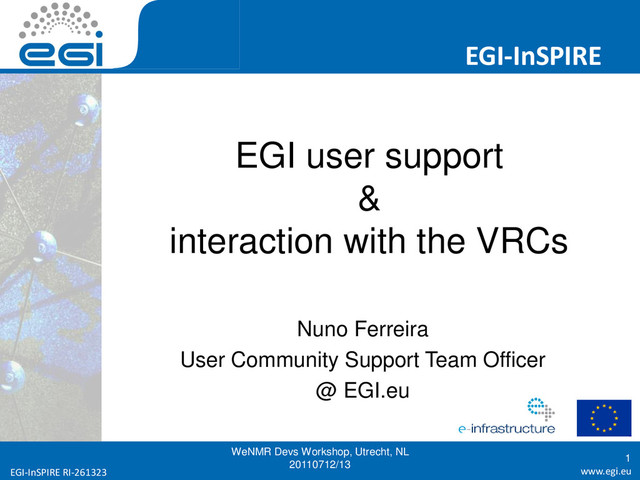 requirements: – 48 resolved within EGI-InSPIRE/UCST – 36 prioritised by UCB of which… – 20 passed via TCB to Technology Providers – 26 still being investigated by UCST • Current issues endorsed by UCB and recognised by TCB: 1. Increased stability and scalability for gLite WMS 2. Better (more verbose and informative) error messages 3. Fixing the known bugs before adding new features 4. Coherency of command line commands, parameters and APIs 5. Better feedback about jobs, automated resubmission of jobs stuck on sites • Requirements to be refined in community workshops • Data management, Workflow systems & Workload management • Use to define and build EGI VRC User support platform WeNMR Devs Workshop, Utrecht, NL 20110712/13 25 Proved to be an effective communication channel with EMI and other external Technology Providers 60 requirements also generated from legacy documents from VRCs: SHARE Roadmap (HealthGrid), ESFRI project reqs., Production Grid Infrastucture (OGF), Request for Enhancements of gLite to support bio-NMR applications, gLite requirements (EGEE), User requirements (EGI-DS), DRIHMS Questionnaire