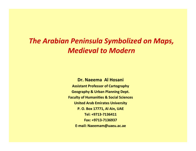 to Modern Dr. Naeema Al Hosani Assistant Professor of Cartography Geography & Urban Planning Dept. Faculty of Humani?es & Social Sciences United Arab Emirates University P. O. Box 17771, Al Ain, UAE Tel: +9713-‐7136411 Fax: +9713-‐7136937 E-‐mail: [email protected]