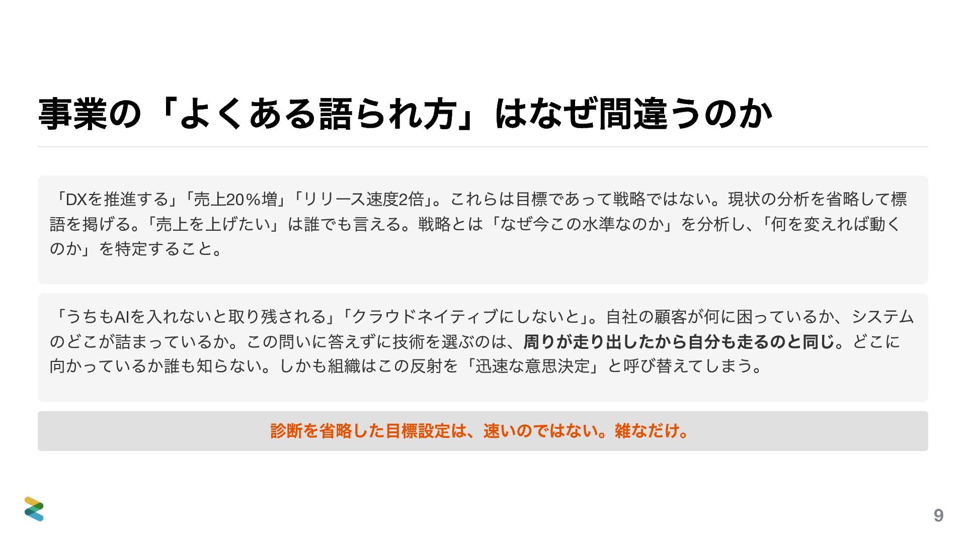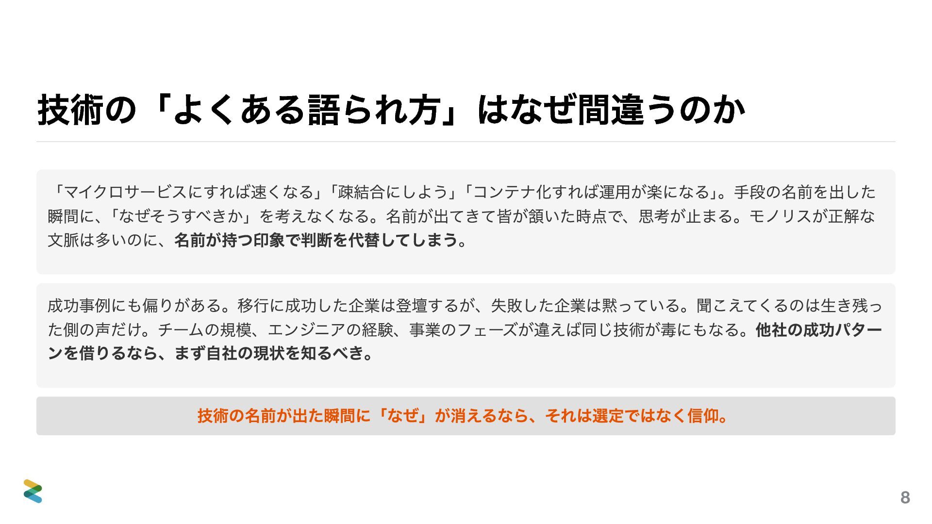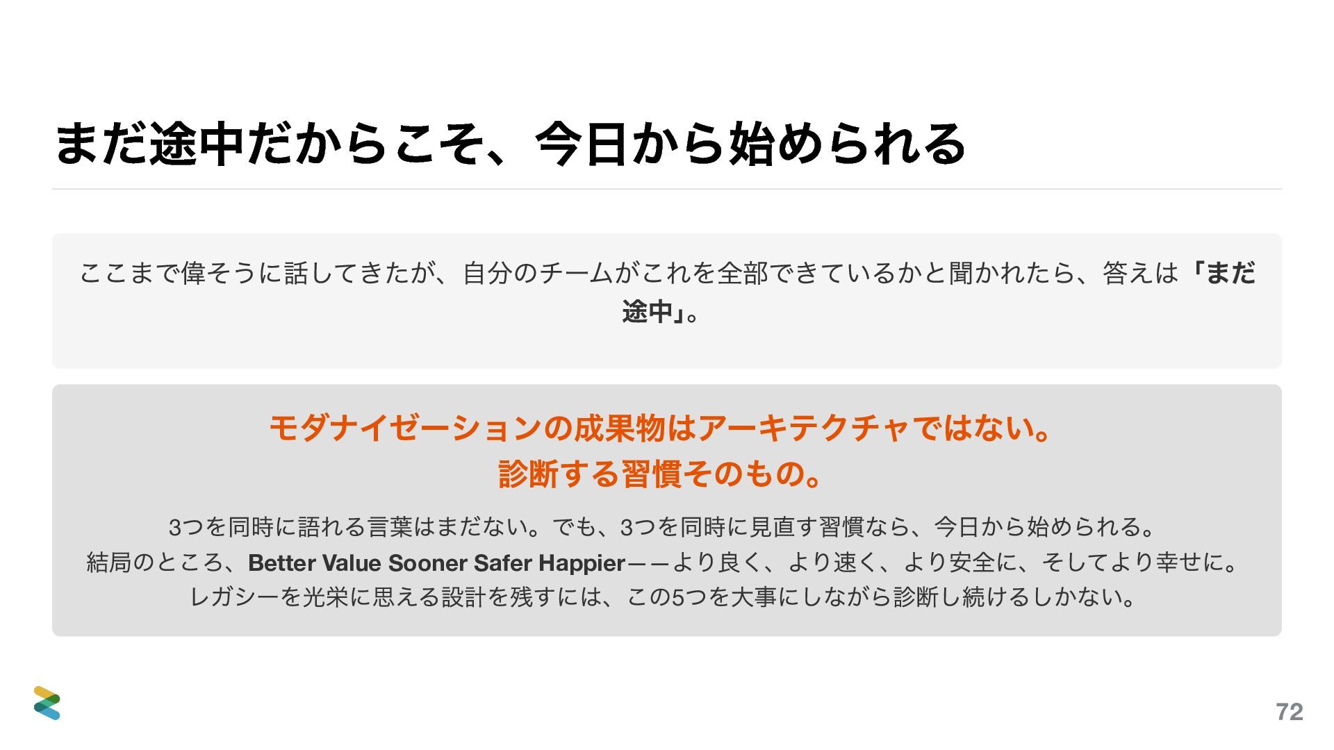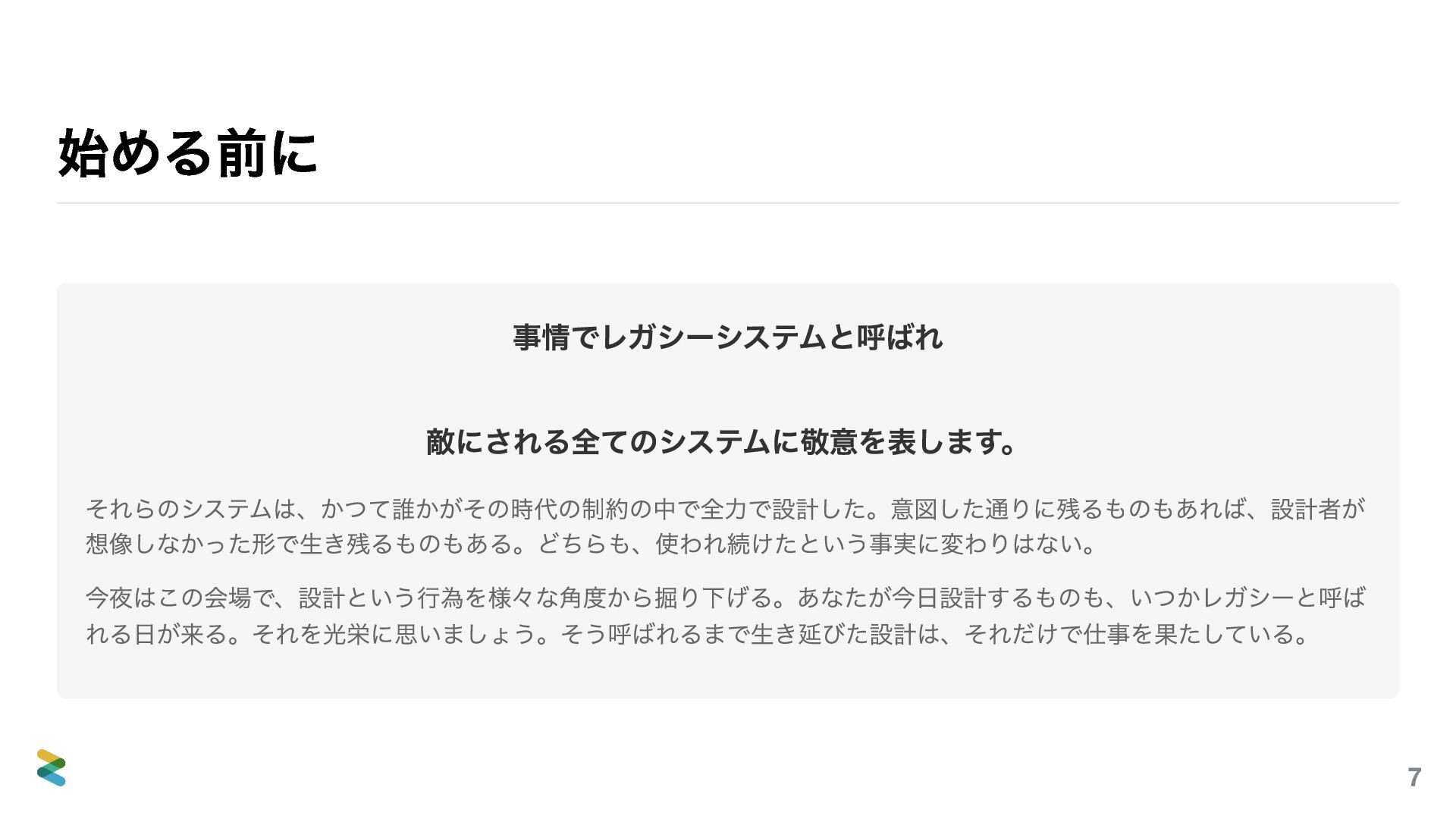削減途中なスライドもありますがこちらでは完全版の資料を提供いたします。ただ、こちらのほうが良いということでは決してありません。当日あの場で聴いてくださった皆さんの時間のほうが、何倍も価値があります。