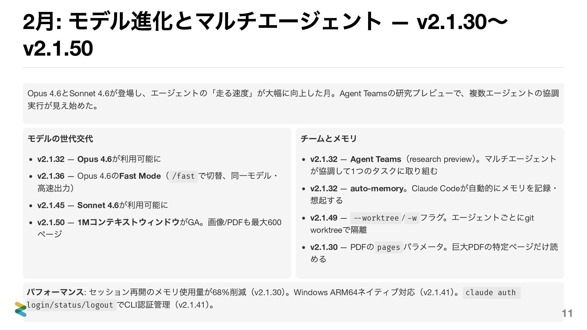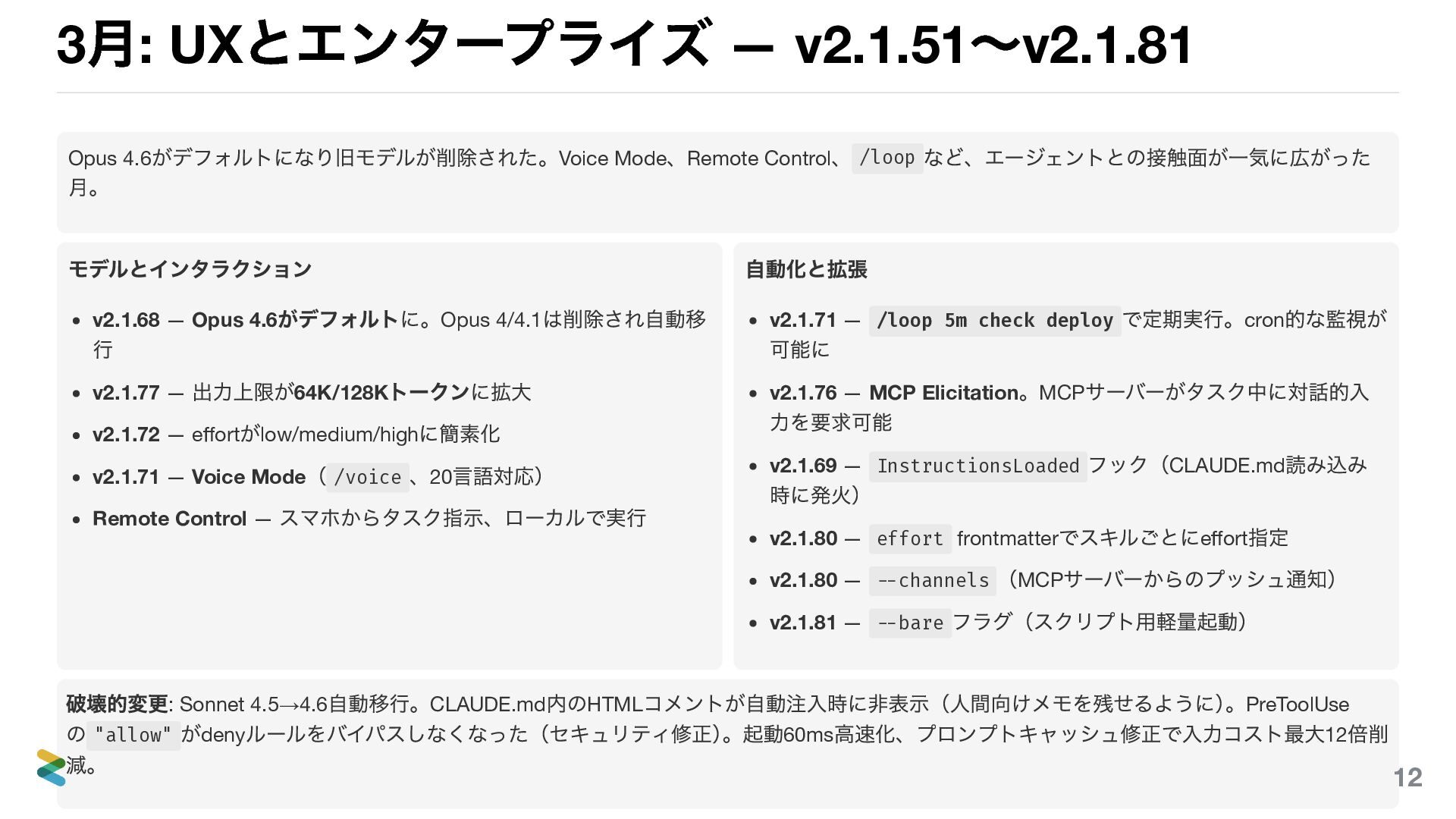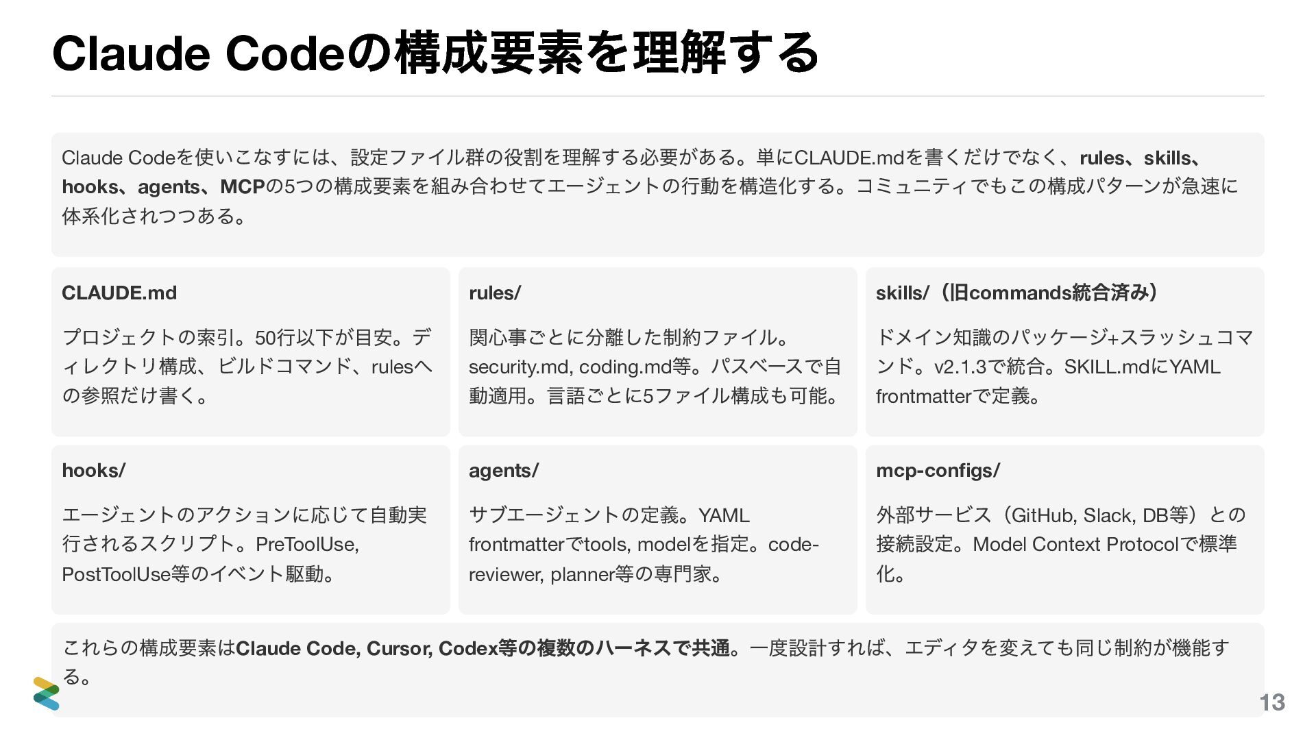 への直接push 、.unwrap() 。MUST: テスト、フィーチャ ーブランチ coding.md — コミットフォーマット、言語ごとの品質コマ ンド プロジェクトルール (.claude/rules/) リポジトリ固有の制約。チーム全員に適用される。 slide-writing.md — スライド記法、構成ルール、パンチ ラインの文体 marp-theme-build.md — ビルド手順、PDF 出力の注意点 パスベースの自動適用 — rules ファイルのfrontmatter に paths: slides/**/*.md と書けば、そのパターンに一致するファイルを 編集するときだけ自動的にルールが読み込まれる。スライド編集時にはスライドのルールが、CSS 編集時にはテーマのルールが、 それぞれ必要なときだけ適用される。 home- prefix で区別する — グローバルに置くagents やskills は home- をprefix につけることで、プロジェクト固有のものと名前が 衝突しない。 26