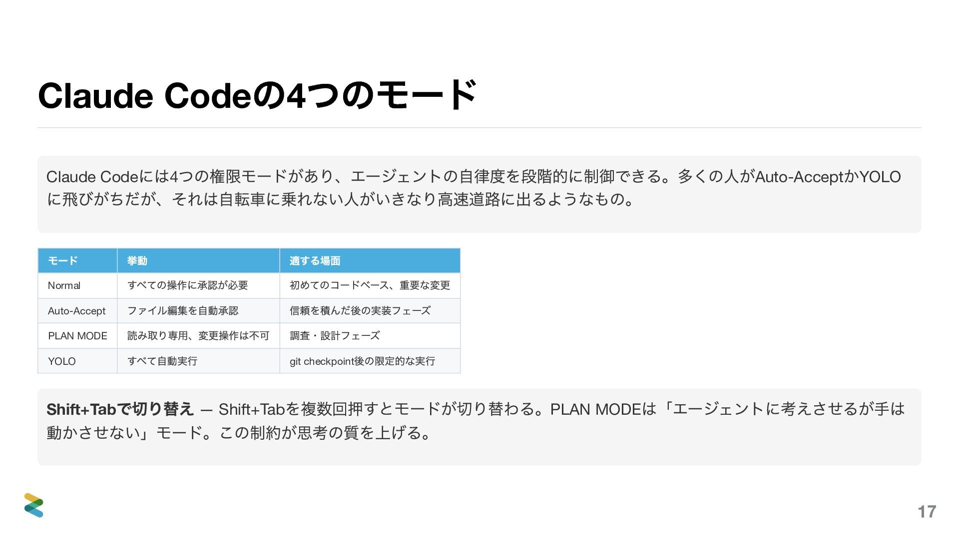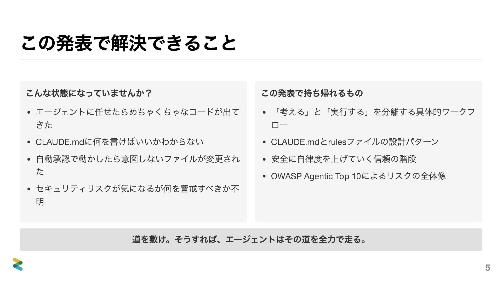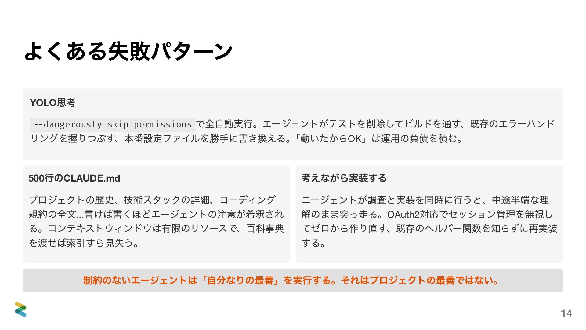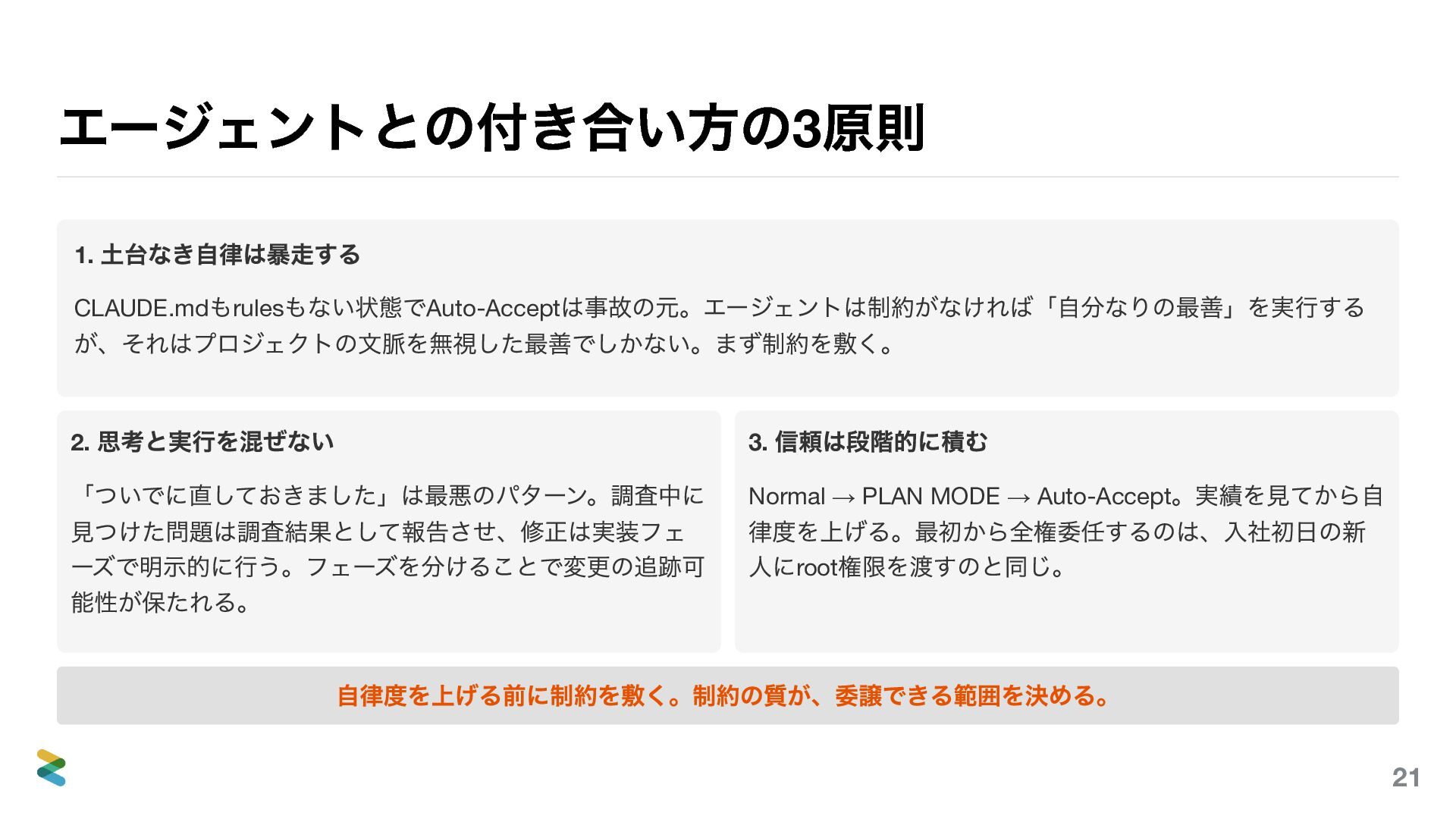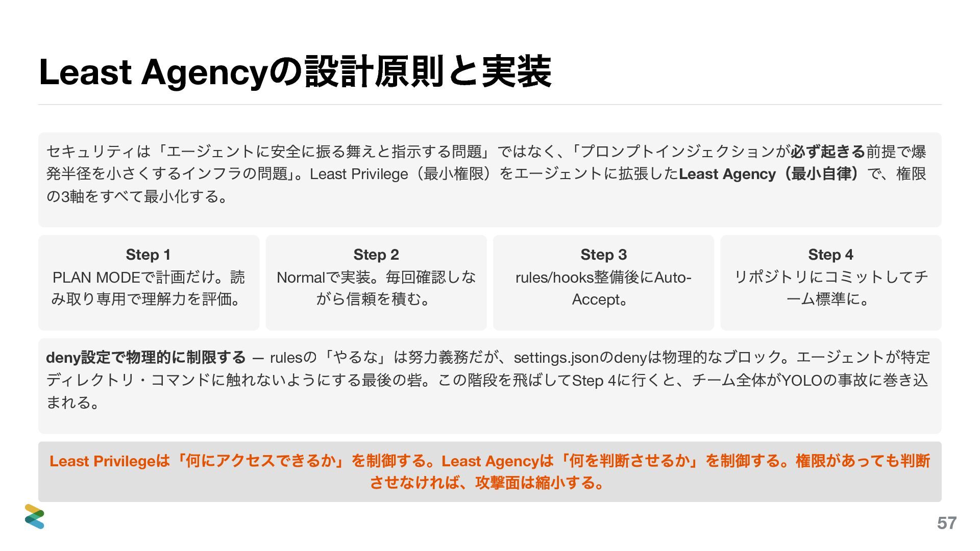 (最小自律)で、権限 の3 軸をすべて最小化する。 Step 1 PLAN MODE で計画だけ。読 み取り専用で理解力を評価。 Step 2 Normal で実装。毎回確認しな がら信頼を積む。 Step 3 rules/hooks 整備後にAuto- Accept 。 Step 4 リポジトリにコミットしてチ ーム標準に。 deny 設定で物理的に制限する — rules の「やるな」は努力義務だが、settings.json のdeny は物理的なブロック。エージェントが特定 ディレクトリ・コマンドに触れないようにする最後の砦。この階段を飛ばしてStep 4 に行くと、チーム全体がYOLO の事故に巻き込 まれる。 Least Privilege は「何にアクセスできるか」を制御する。Least Agency は「何を判断させるか」を制御する。権限があっても判断 させなければ、攻撃面は縮小する。 57