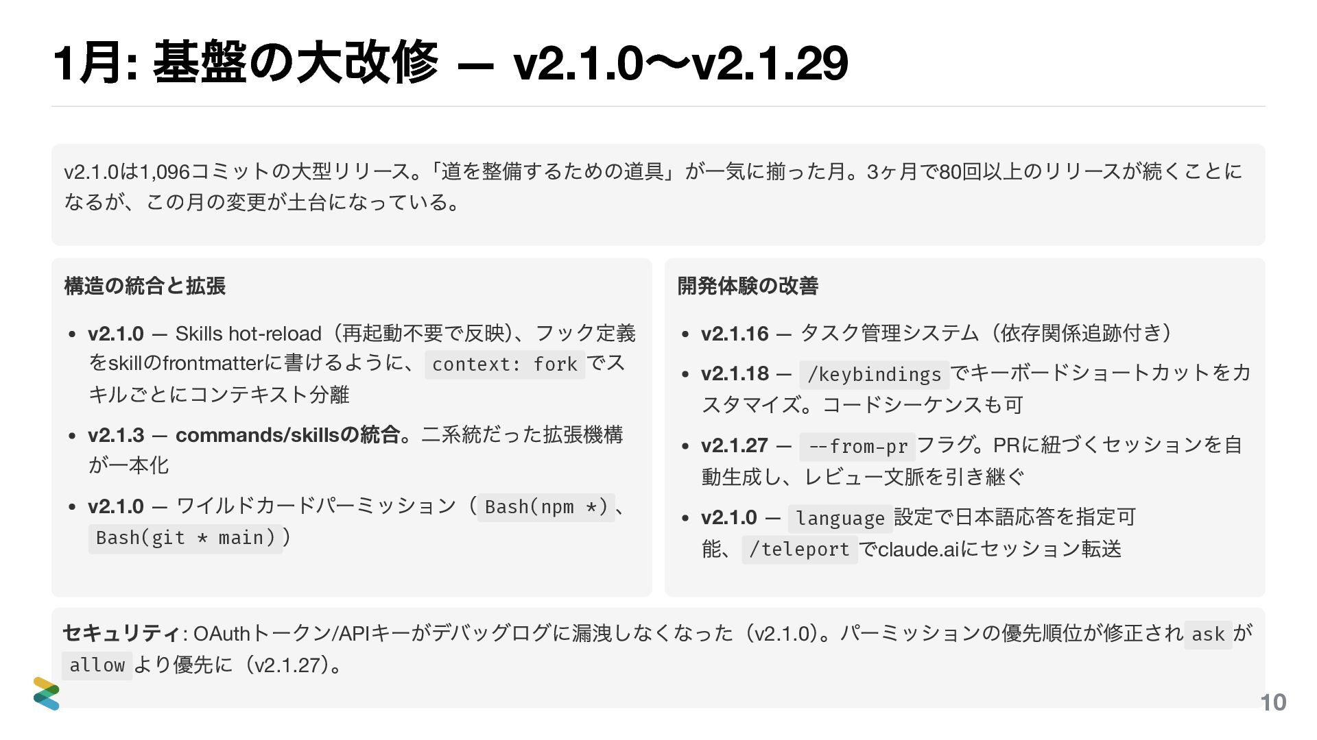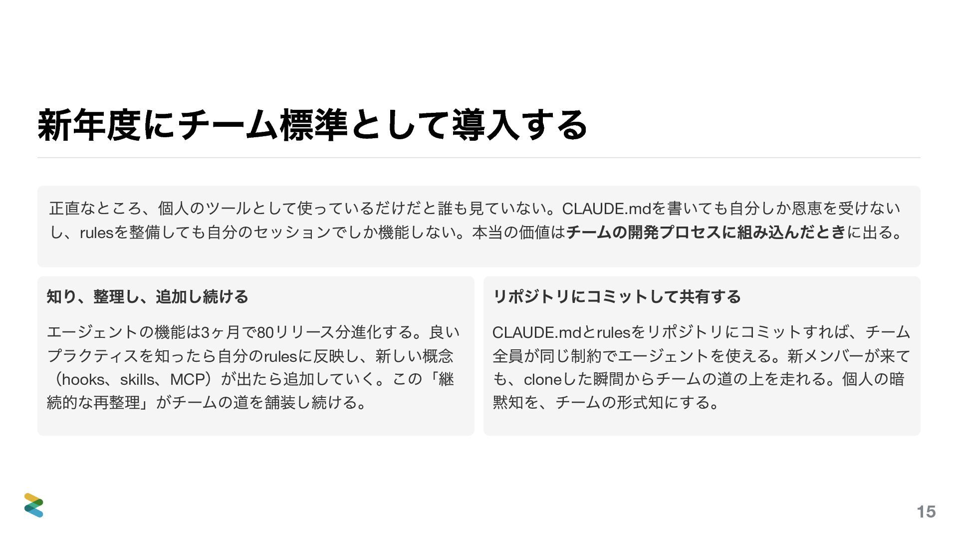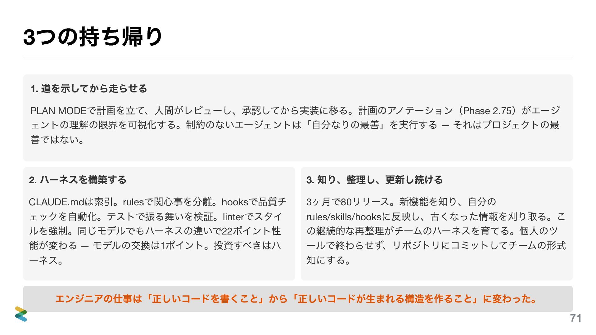 — それはプロジェクトの最 善ではない。 2. ハーネスを構築する CLAUDE.md は索引。rules で関心事を分離。hooks で品質チ ェックを自動化。テストで振る舞いを検証。linter でスタイ ルを強制。同じモデルでもハーネスの違いで22 ポイント性 能が変わる — モデルの交換は1 ポイント。投資すべきはハ ーネス。 3. 知り、整理し、更新し続ける 3 ヶ月で80 リリース。新機能を知り、自分の rules/skills/hooks に反映し、古くなった情報を刈り取る。こ の継続的な再整理がチームのハーネスを育てる。個人のツ ールで終わらせず、リポジトリにコミットしてチームの形式 知にする。 エンジニアの仕事は「正しいコードを書くこと」から「正しいコードが生まれる構造を作ること」に変わった。 71