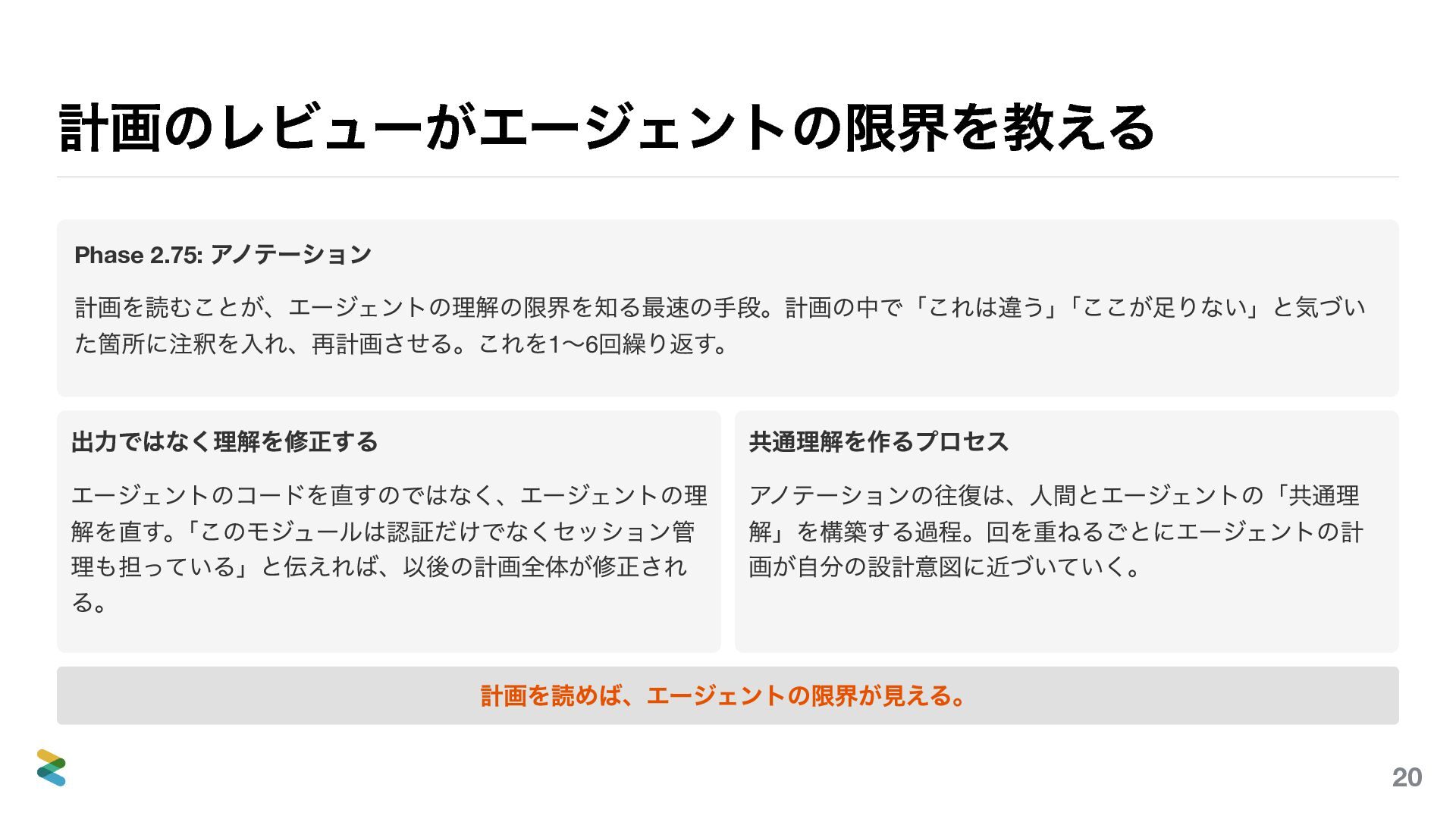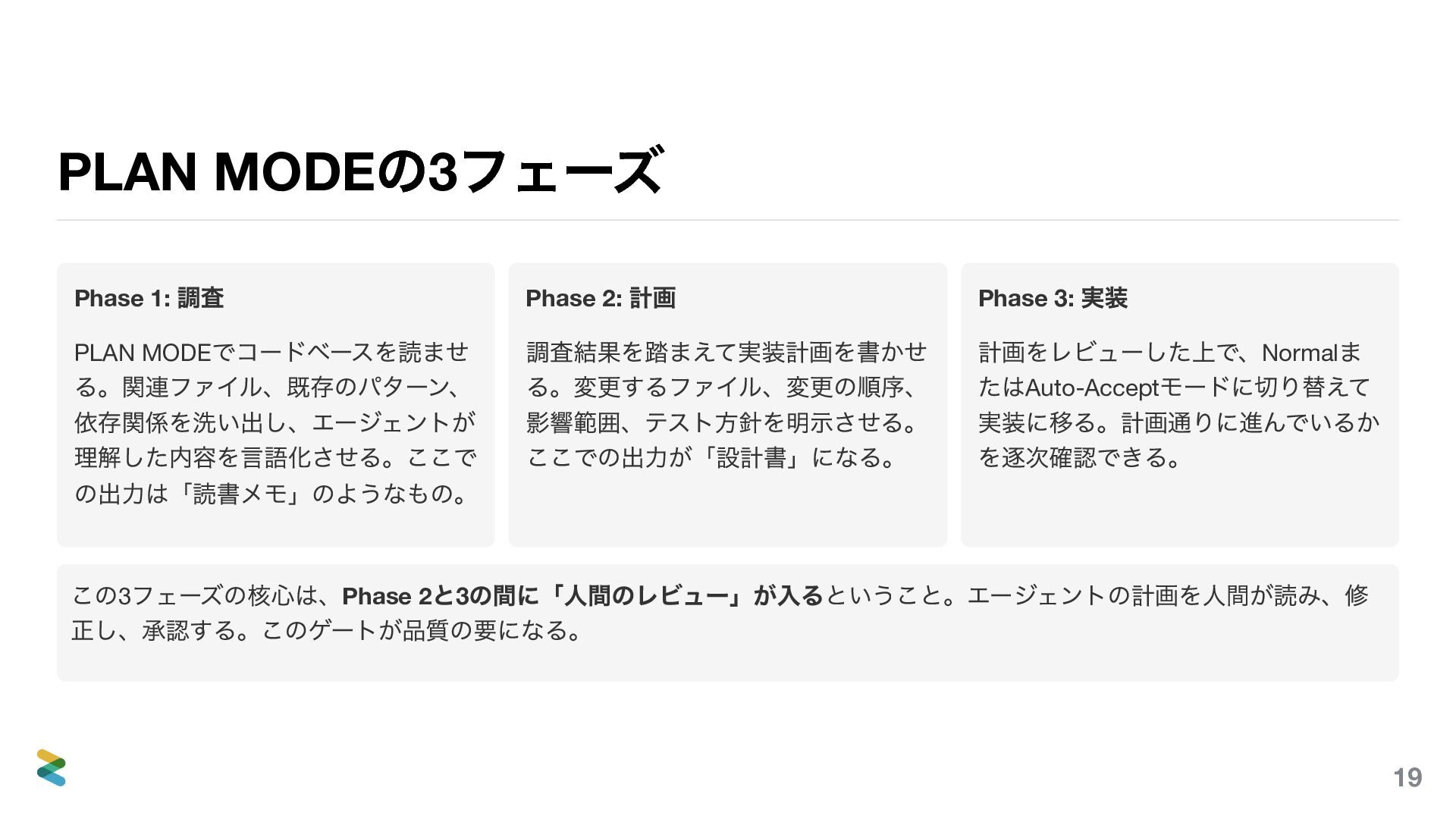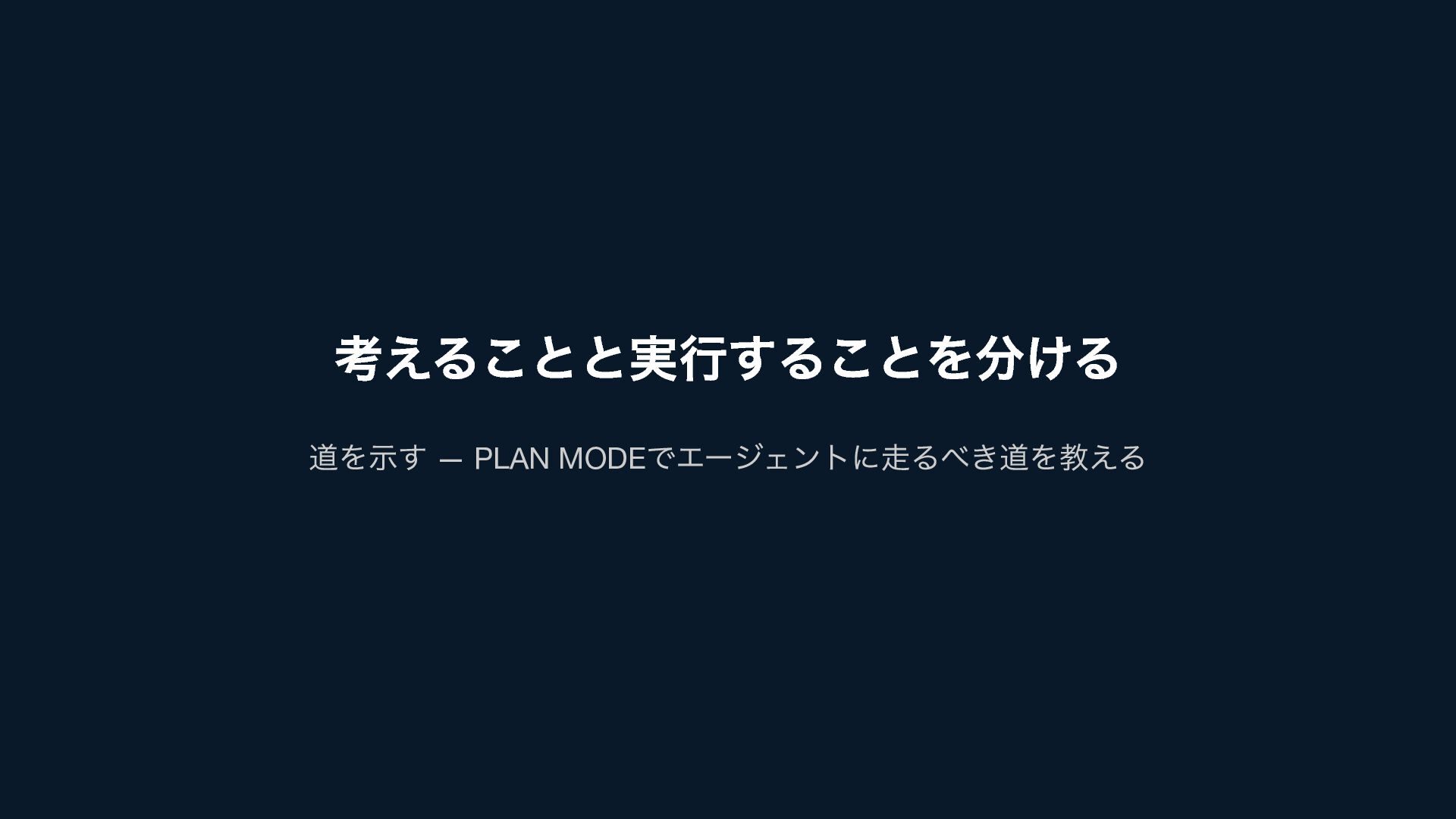 3 つの持ち帰り 1. 道を示してから走らせる PLAN MODE で計画を立て、人間がレビューし、承認してから実装に移る。計画のアノテーション(Phase 2.75 )がエージ ェントの理解の限界を可視化する。制約のないエージェントは「自分なりの最善」を実行する
