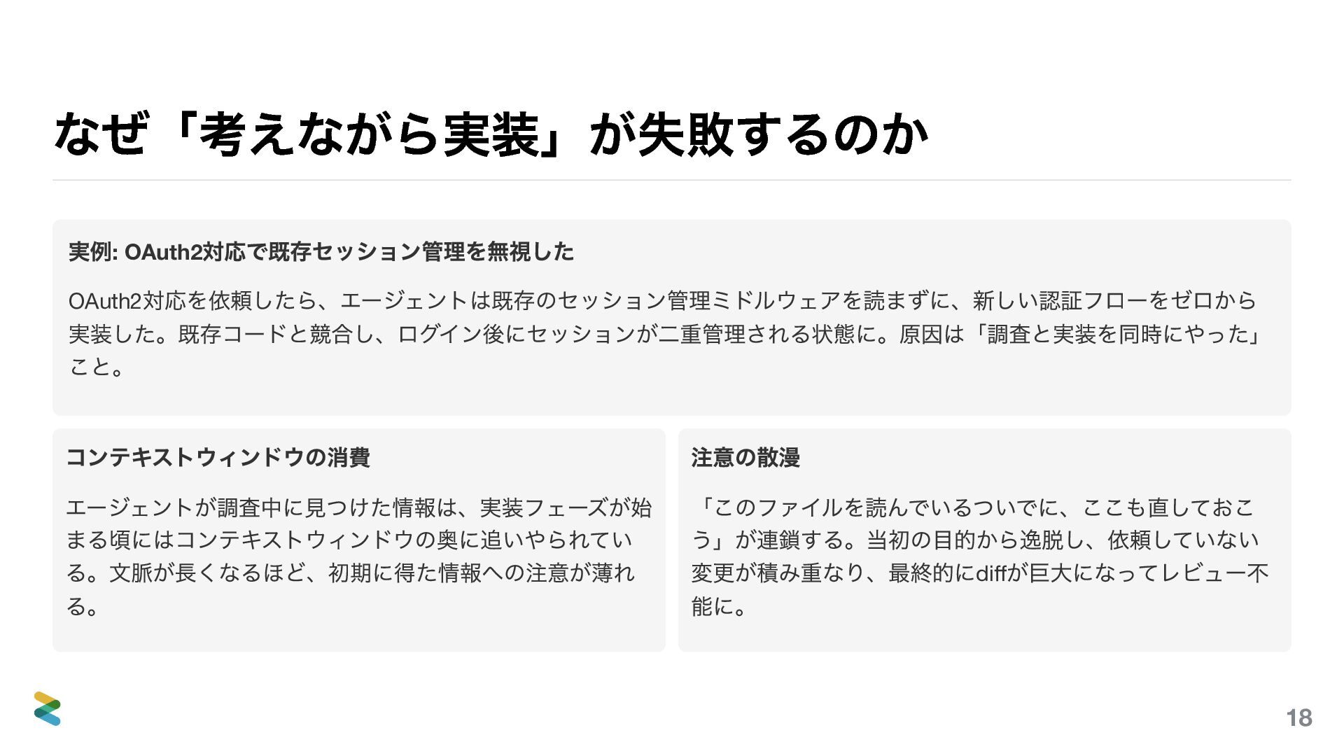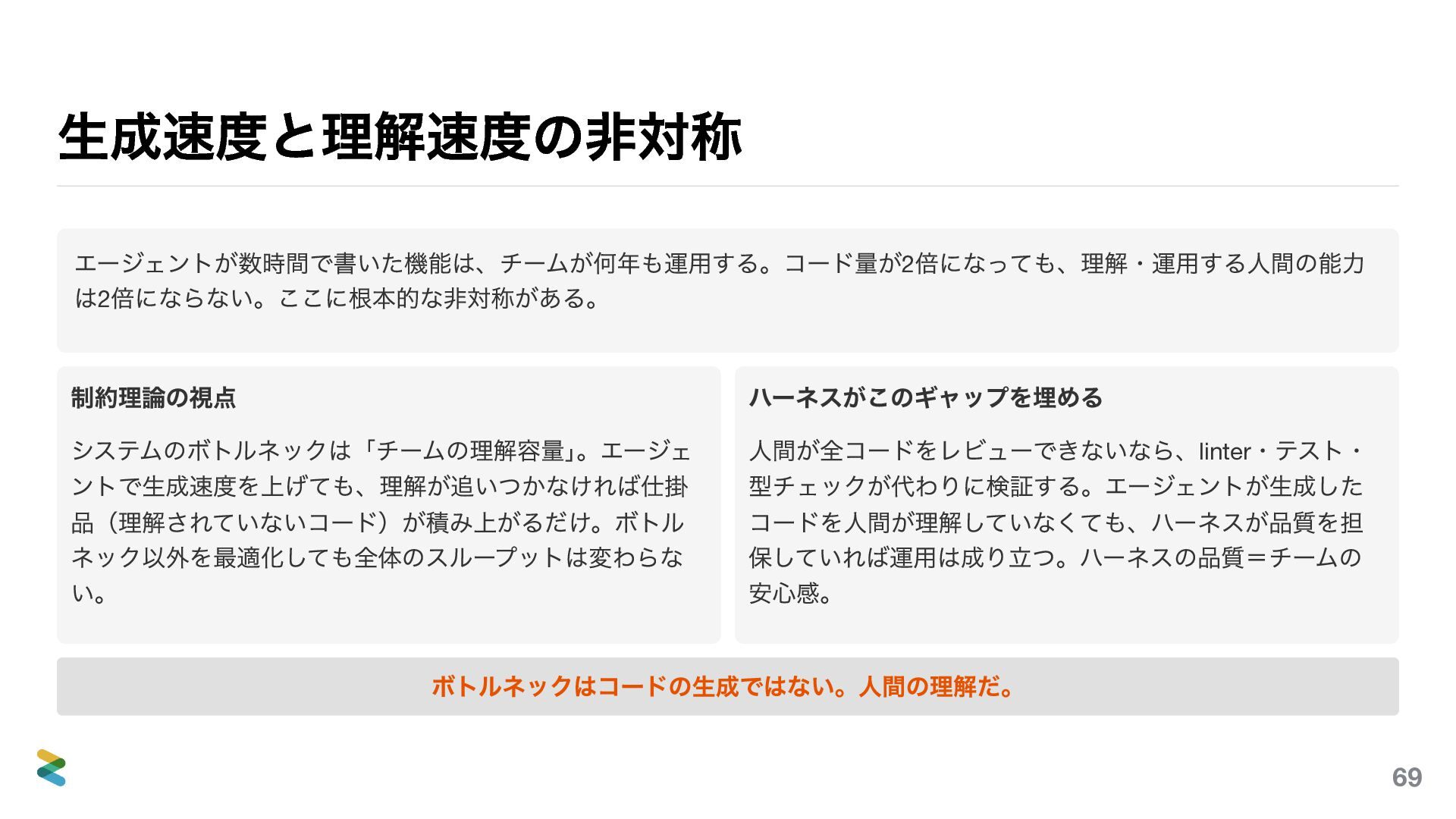 生成速度と理解速度の非対称 エージェントが数時間で書いた機能は、チームが何年も運用する。コード量が2 倍になっても、理解・運用する人間の能力 は2 倍にならない。ここに根本的な非対称がある。 制約理論の視点 システムのボトルネックは「チームの理解容量」 。エージェ ントで生成速度を上げても、理解が追いつかなければ仕掛 品(理解されていないコード)が積み上がるだけ。ボトル