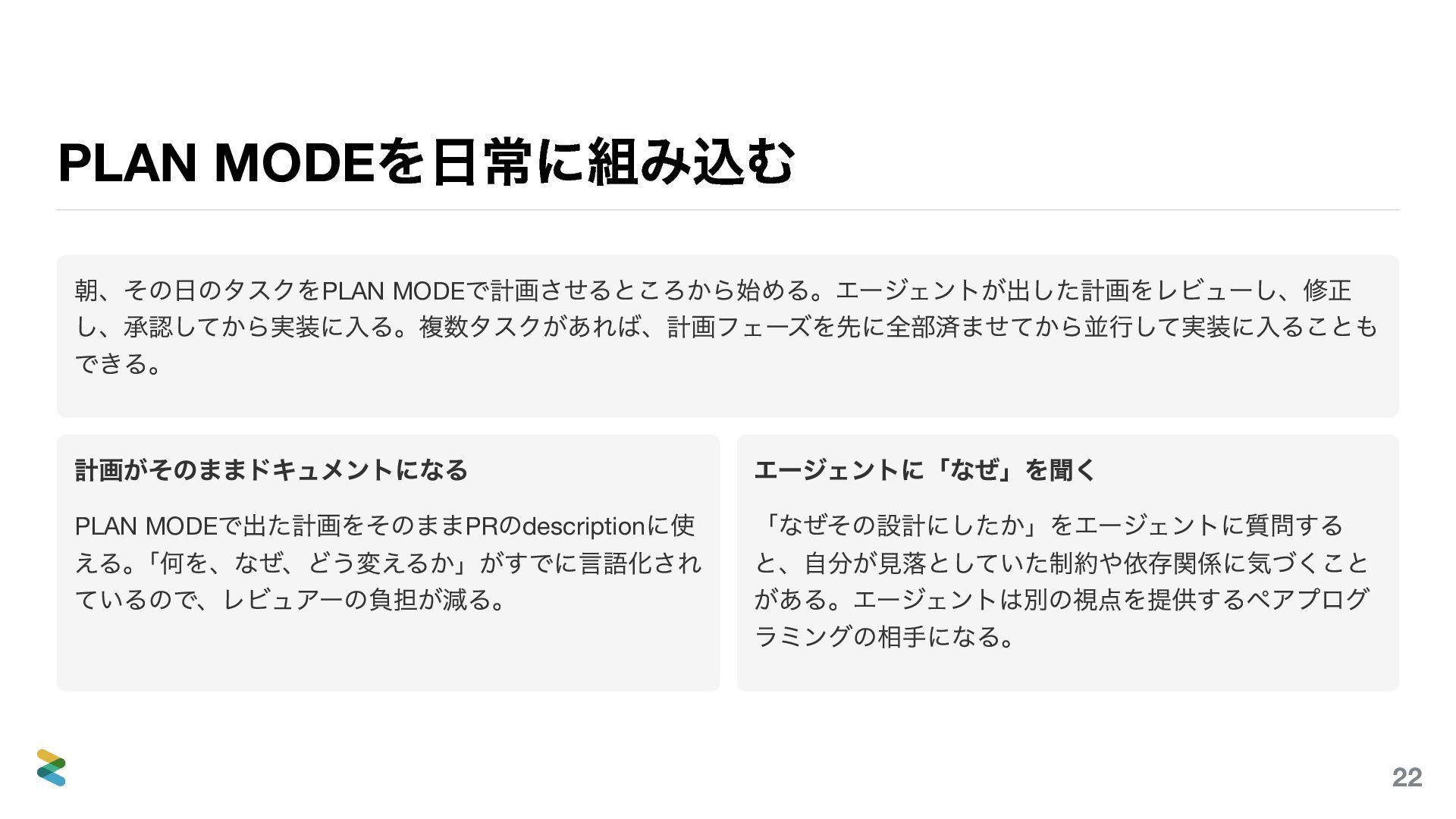 MODE で出た計画をそのままPR のdescription に使 える。 「何を、なぜ、どう変えるか」がすでに言語化され ているので、レビュアーの負担が減る。 エージェントに「なぜ」を聞く 「なぜその設計にしたか」をエージェントに質問する と、自分が見落としていた制約や依存関係に気づくこと がある。エージェントは別の視点を提供するペアプログ ラミングの相手になる。 22