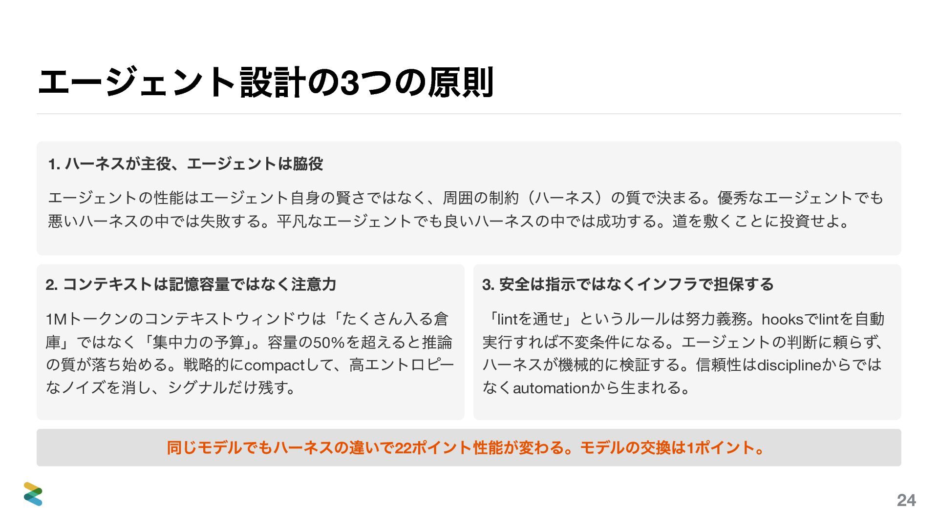 庫」ではなく「集中力の予算」 。容量の50% を超えると推論 の質が落ち始める。戦略的にcompact して、高エントロピー なノイズを消し、シグナルだけ残す。 3. 安全は指示ではなくインフラで担保する 「lint を通せ」というルールは努力義務。hooks でlint を自動 実行すれば不変条件になる。エージェントの判断に頼らず、 ハーネスが機械的に検証する。信頼性はdiscipline からでは なくautomation から生まれる。 同じモデルでもハーネスの違いで22 ポイント性能が変わる。モデルの交換は1 ポイント。 24