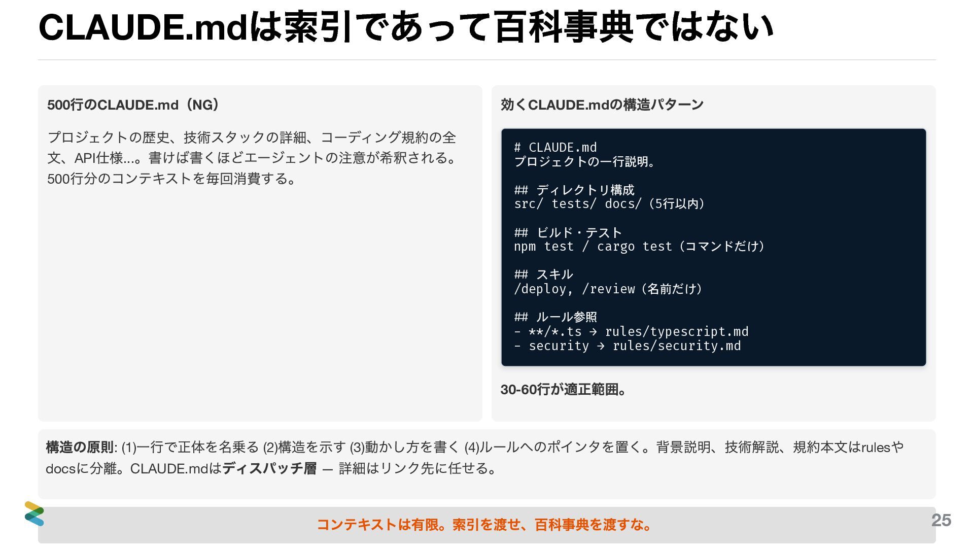 500 行分のコンテキストを毎回消費する。 効くCLAUDE.md の構造パターン # CLAUDE.md プロジェクトの一行説明。 ## ディレクトリ構成 src/ tests/ docs/(5行以内) ## ビルド・テスト npm test / cargo test(コマンドだけ) ## スキル /deploy, /review(名前だけ) ## ルール参照 - **/*.ts → rules/typescript.md - security → rules/security.md 30-60 行が適正範囲。 構造の原則: (1) 一行で正体を名乗る (2) 構造を示す (3) 動かし方を書く (4) ルールへのポインタを置く。背景説明、技術解説、規約本文はrules や docs に分離。CLAUDE.md はディスパッチ層 — 詳細はリンク先に任せる。 コンテキストは有限。索引を渡せ、百科事典を渡すな。 25