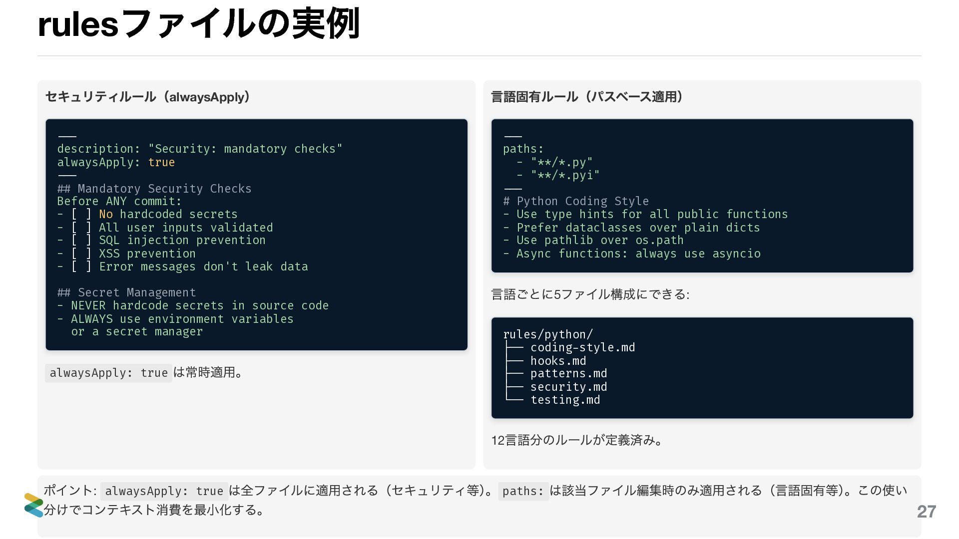 true --- ## Mandatory Security Checks Before ANY commit: - [ ] No hardcoded secrets - [ ] All user inputs validated - [ ] SQL injection prevention - [ ] XSS prevention - [ ] Error messages don't leak data ## Secret Management - NEVER hardcode secrets in source code - ALWAYS use environment variables or a secret manager alwaysApply: true は常時適用。 言語固有ルール(パスベース適用) --- paths: - "**/*.py" - "**/*.pyi" --- # Python Coding Style - Use type hints for all public functions - Prefer dataclasses over plain dicts - Use pathlib over os.path - Async functions: always use asyncio 言語ごとに5 ファイル構成にできる: rules/python/ ├── coding-style.md ├── hooks.md ├── patterns.md ├── security.md └── testing.md 12 言語分のルールが定義済み。 ポイント: alwaysApply: true は全ファイルに適用される(セキュリティ等) 。 paths: は該当ファイル編集時のみ適用される(言語固有等) 。この使い 分けでコンテキスト消費を最小化する。 27