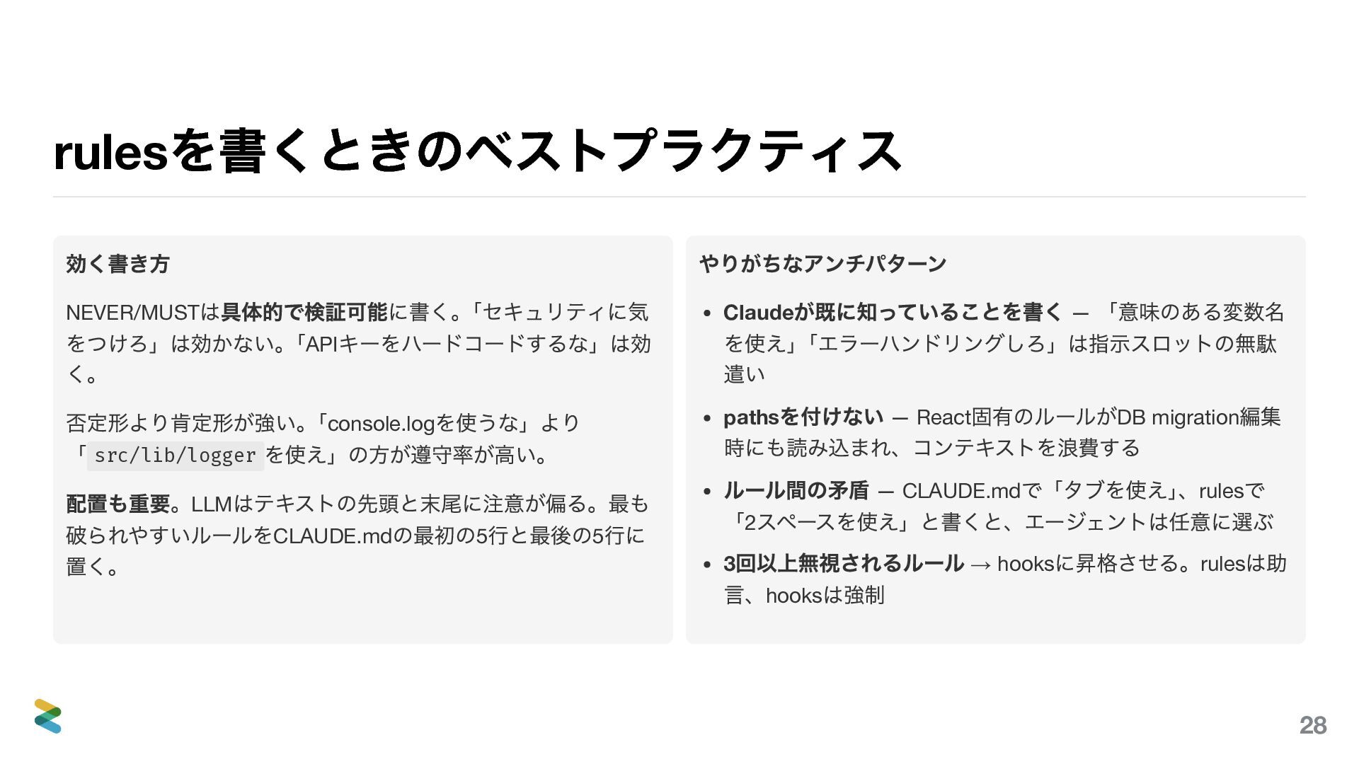 否定形より肯定形が強い。 「console.log を使うな」より 「 src/lib/logger を使え」の方が遵守率が高い。 配置も重要。LLM はテキストの先頭と末尾に注意が偏る。最も 破られやすいルールをCLAUDE.md の最初の5 行と最後の5 行に 置く。 やりがちなアンチパターン Claude が既に知っていることを書く — 「意味のある変数名 を使え」 「エラーハンドリングしろ」は指示スロットの無駄 遣い paths を付けない — React 固有のルールがDB migration 編集 時にも読み込まれ、コンテキストを浪費する ルール間の矛盾 — CLAUDE.md で「タブを使え」 、rules で 「2 スペースを使え」と書くと、エージェントは任意に選ぶ 3 回以上無視されるルール → hooks に昇格させる。rules は助 言、hooks は強制 28