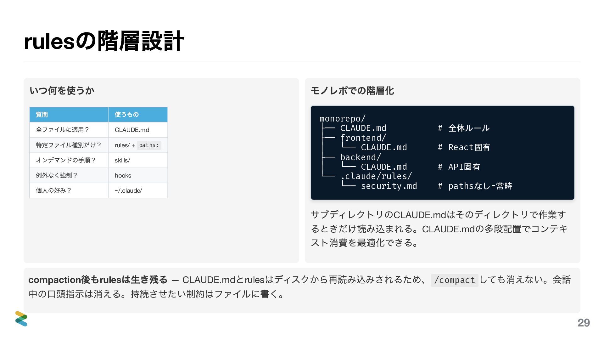 paths: オンデマンドの手順? skills/ 例外なく強制? hooks 個人の好み? ~/.claude/ モノレポでの階層化 monorepo/ ├── CLAUDE.md # 全体ルール ├── frontend/ │ └── CLAUDE.md # React固有 ├── backend/ │ └── CLAUDE.md # API固有 └── .claude/rules/ └── security.md # pathsなし=常時 サブディレクトリのCLAUDE.md はそのディレクトリで作業す るときだけ読み込まれる。CLAUDE.md の多段配置でコンテキ スト消費を最適化できる。 compaction 後もrules は生き残る — CLAUDE.md とrules はディスクから再読み込みされるため、 /compact しても消えない。会話 中の口頭指示は消える。持続させたい制約はファイルに書く。 29