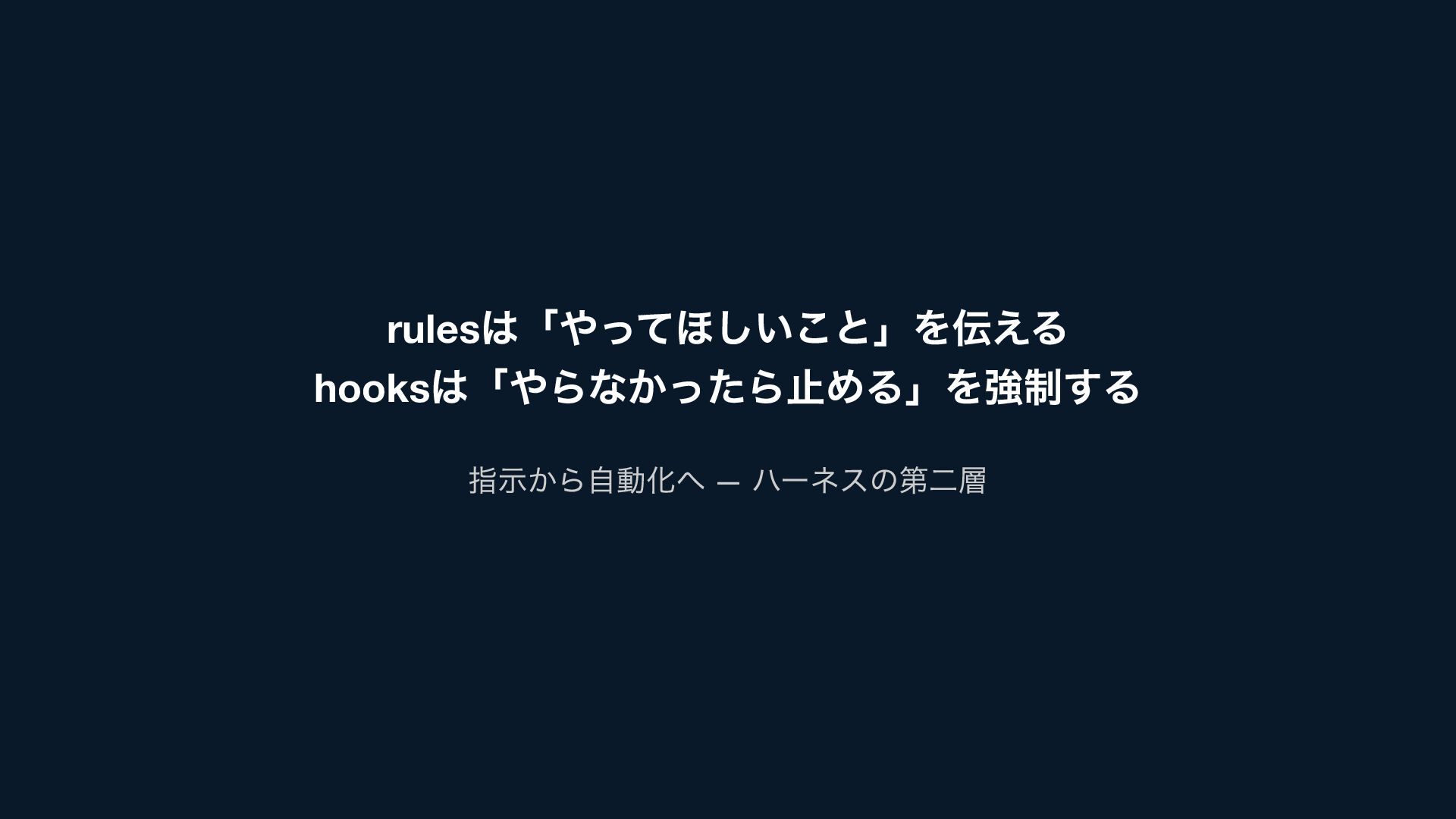 rules は「やってほしいこと」を伝える hooks は「やらなかったら止める」を強制する 指示から自動化へ — ハーネスの第二層