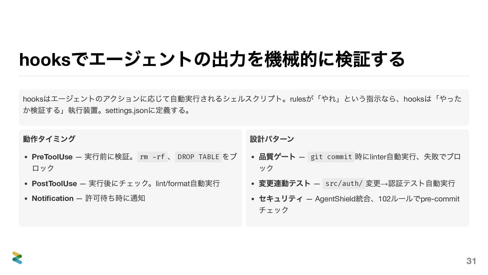 — 実行前に検証。 rm -rf 、 DROP TABLE をブ ロック PostToolUse — 実行後にチェック。lint/format 自動実行 Notification — 許可待ち時に通知 設計パターン 品質ゲート — git commit 時にlinter 自動実行、失敗でブロ ック 変更連動テスト — src/auth/ 変更→ 認証テスト自動実行 セキュリティ — AgentShield 統合、102 ルールでpre-commit チェック 31