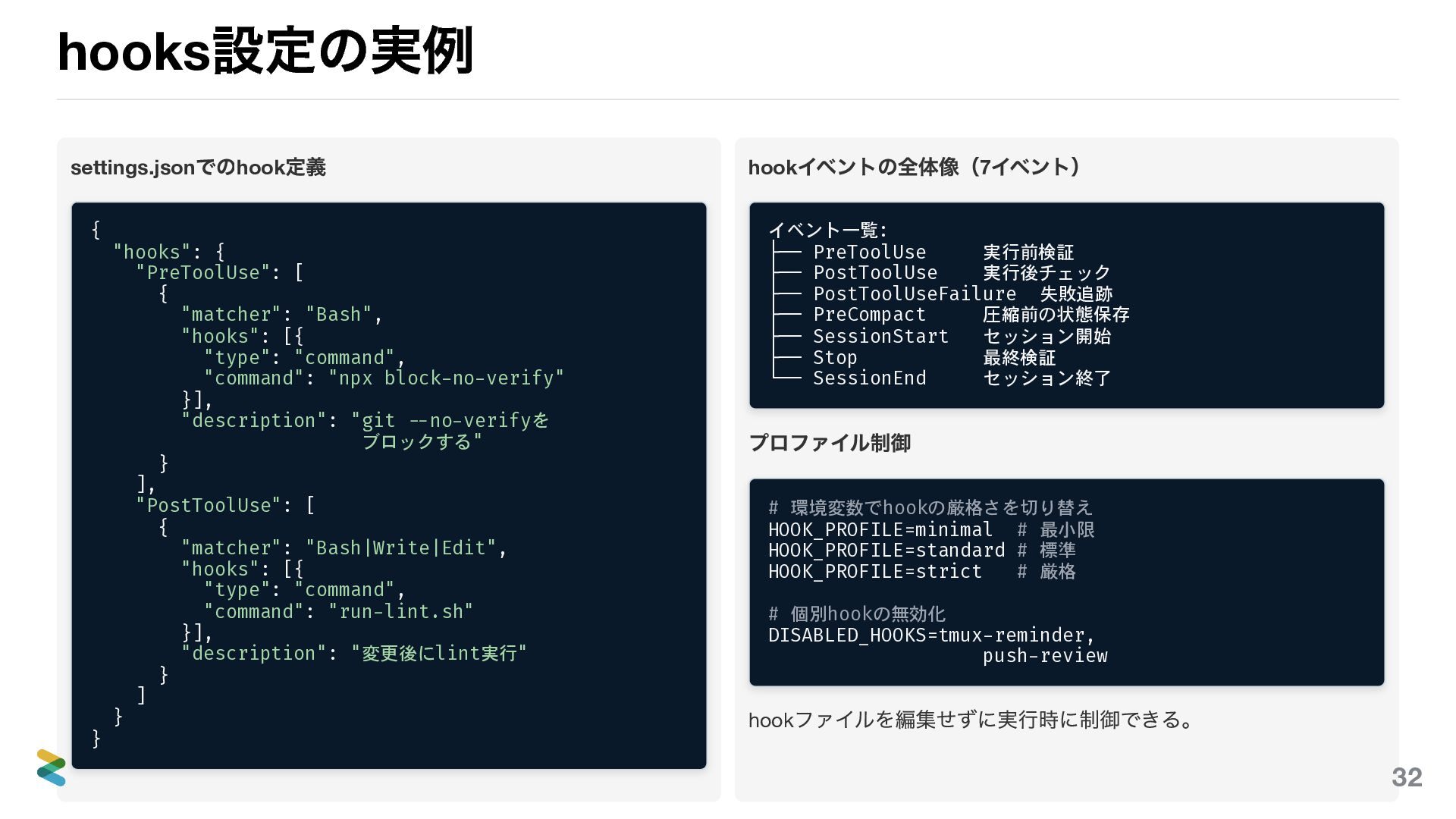 { "matcher": "Bash", "hooks": [{ "type": "command", "command": "npx block-no-verify" }], "description": "git --no-verifyを ブロックする" } ], "PostToolUse": [ { "matcher": "Bash|Write|Edit", "hooks": [{ "type": "command", "command": "run-lint.sh" }], "description": "変更後にlint実行" } ] } } hook イベントの全体像(7 イベント) イベント一覧: ├── PreToolUse 実行前検証 ├── PostToolUse 実行後チェック ├── PostToolUseFailure 失敗追跡 ├── PreCompact 圧縮前の状態保存 ├── SessionStart セッション開始 ├── Stop 最終検証 └── SessionEnd セッション終了 プロファイル制御 # 環境変数でhookの厳格さを切り替え HOOK_PROFILE=minimal # 最小限 HOOK_PROFILE=standard # 標準 HOOK_PROFILE=strict # 厳格 # 個別hookの無効化 DISABLED_HOOKS=tmux-reminder, push-review hook ファイルを編集せずに実行時に制御できる。 32