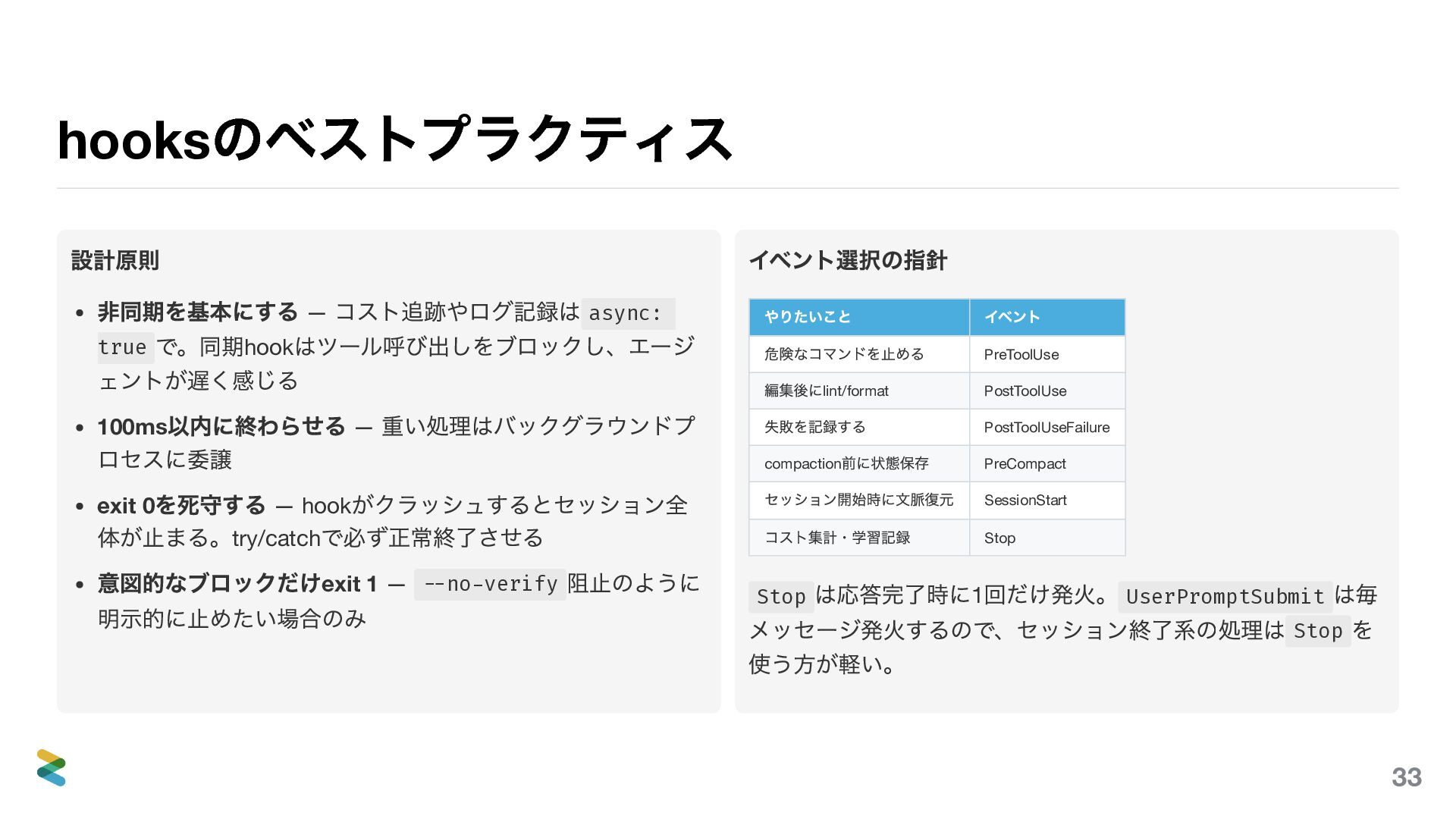 ェントが遅く感じる 100ms 以内に終わらせる — 重い処理はバックグラウンドプ ロセスに委譲 exit 0 を死守する — hook がクラッシュするとセッション全 体が止まる。try/catch で必ず正常終了させる 意図的なブロックだけexit 1 — --no-verify 阻止のように 明示的に止めたい場合のみ イベント選択の指針 やりたいこと イベント 危険なコマンドを止める PreToolUse 編集後にlint/format PostToolUse 失敗を記録する PostToolUseFailure compaction 前に状態保存 PreCompact セッション開始時に文脈復元 SessionStart コスト集計・学習記録 Stop Stop は応答完了時に1 回だけ発火。 UserPromptSubmit は毎 メッセージ発火するので、セッション終了系の処理は Stop を 使う方が軽い。 33