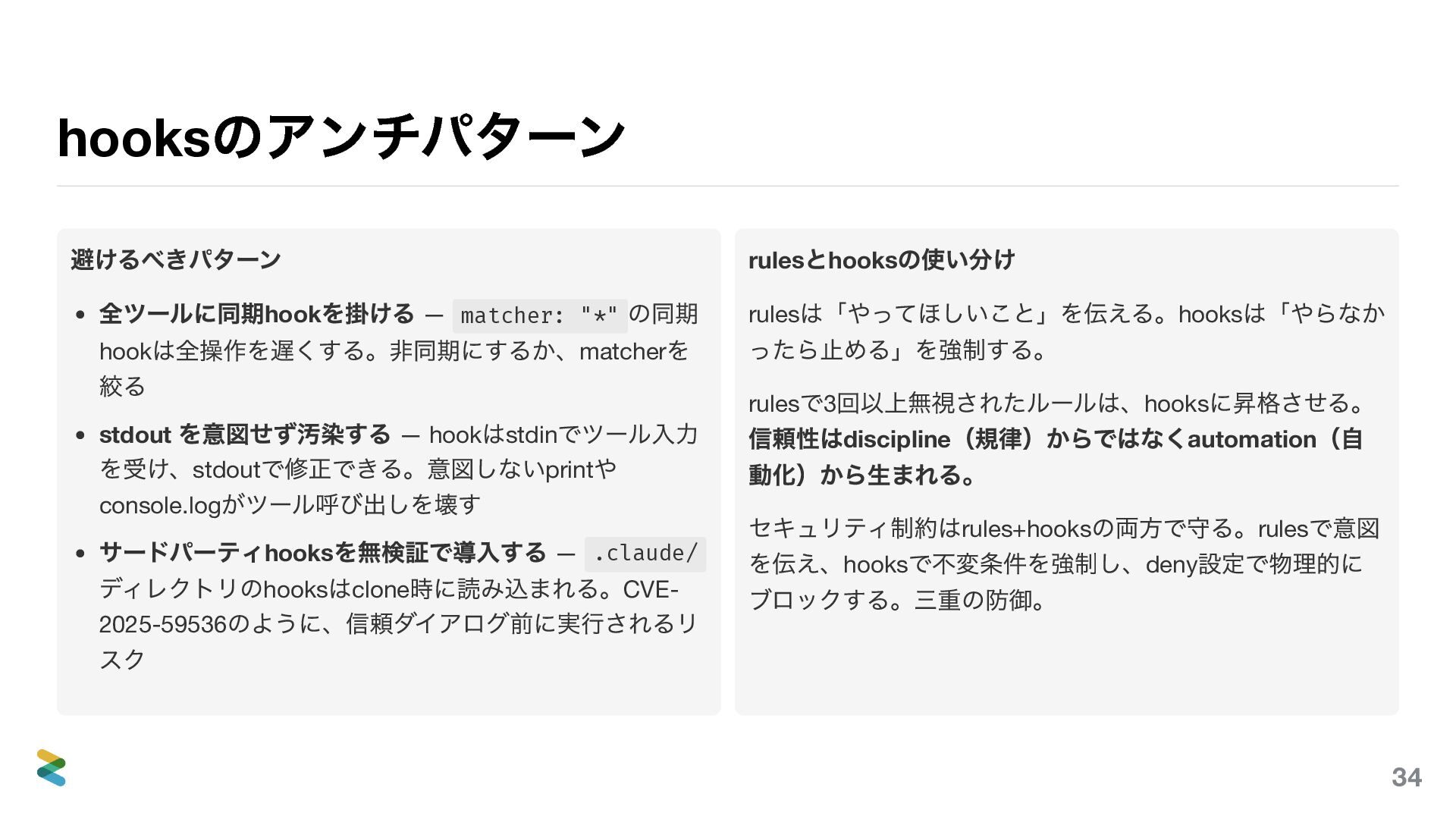 は全操作を遅くする。非同期にするか、matcher を 絞る stdout を意図せず汚染する — hook はstdin でツール入力 を受け、stdout で修正できる。意図しないprint や console.log がツール呼び出しを壊す サードパーティhooks を無検証で導入する — .claude/ ディレクトリのhooks はclone 時に読み込まれる。CVE- 2025-59536 のように、信頼ダイアログ前に実行されるリ スク rules とhooks の使い分け rules は「やってほしいこと」を伝える。hooks は「やらなか ったら止める」を強制する。 rules で3 回以上無視されたルールは、hooks に昇格させる。 信頼性はdiscipline (規律)からではなくautomation (自 動化)から生まれる。 セキュリティ制約はrules+hooks の両方で守る。rules で意図 を伝え、hooks で不変条件を強制し、deny 設定で物理的に ブロックする。三重の防御。 34