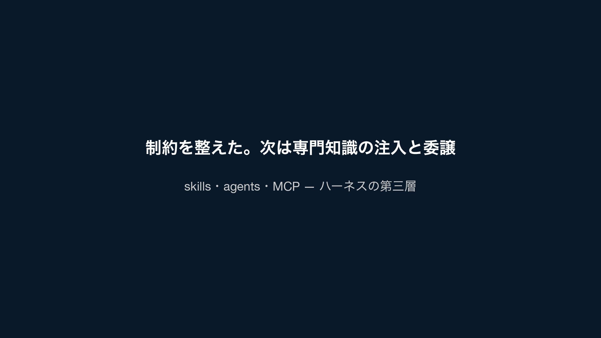 制約を整えた。次は専門知識の注入と委譲 skills ・agents ・MCP — ハーネスの第三層