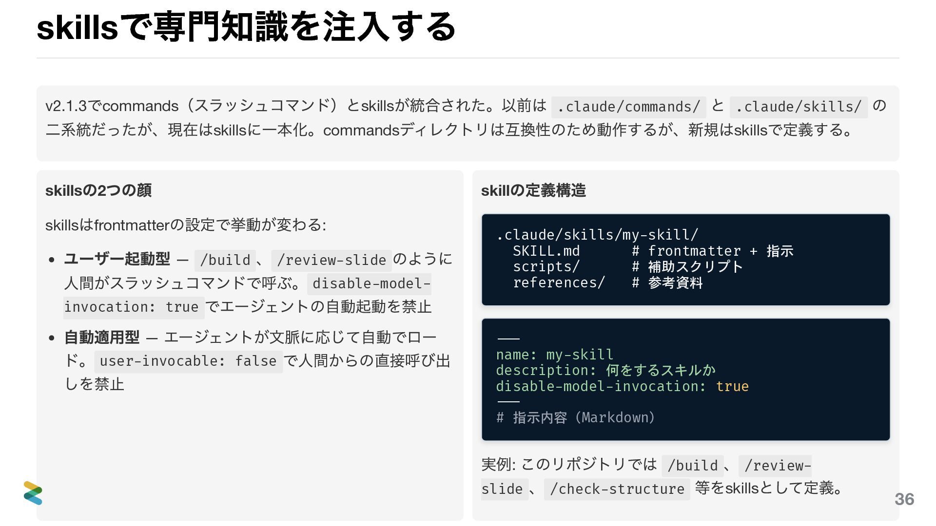 二系統だったが、現在はskills に一本化。commands ディレクトリは互換性のため動作するが、新規はskills で定義する。 skills の2 つの顔 skills はfrontmatter の設定で挙動が変わる: ユーザー起動型 — /build 、 /review-slide のように 人間がスラッシュコマンドで呼ぶ。 disable-model- invocation: true でエージェントの自動起動を禁止 自動適用型 — エージェントが文脈に応じて自動でロー ド。 user-invocable: false で人間からの直接呼び出 しを禁止 skill の定義構造 .claude/skills/my-skill/ SKILL.md # frontmatter + 指示 scripts/ # 補助スクリプト references/ # 参考資料 --- name: my-skill description: 何をするスキルか disable-model-invocation: true --- # 指示内容(Markdown) 実例: このリポジトリでは /build 、 /review- slide 、 /check-structure 等をskills として定義。 36