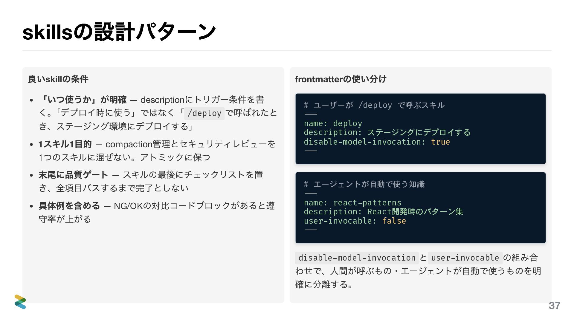 /deploy で呼ばれたと き、ステージング環境にデプロイする」 1 スキル1 目的 — compaction 管理とセキュリティレビューを 1 つのスキルに混ぜない。アトミックに保つ 末尾に品質ゲート — スキルの最後にチェックリストを置 き、全項目パスするまで完了としない 具体例を含める — NG/OK の対比コードブロックがあると遵 守率が上がる frontmatter の使い分け # ユーザーが /deploy で呼ぶスキル --- name: deploy description: ステージングにデプロイする disable-model-invocation: true --- # エージェントが自動で使う知識 --- name: react-patterns description: React開発時のパターン集 user-invocable: false --- disable-model-invocation と user-invocable の組み合 わせで、人間が呼ぶもの・エージェントが自動で使うものを明 確に分離する。 37