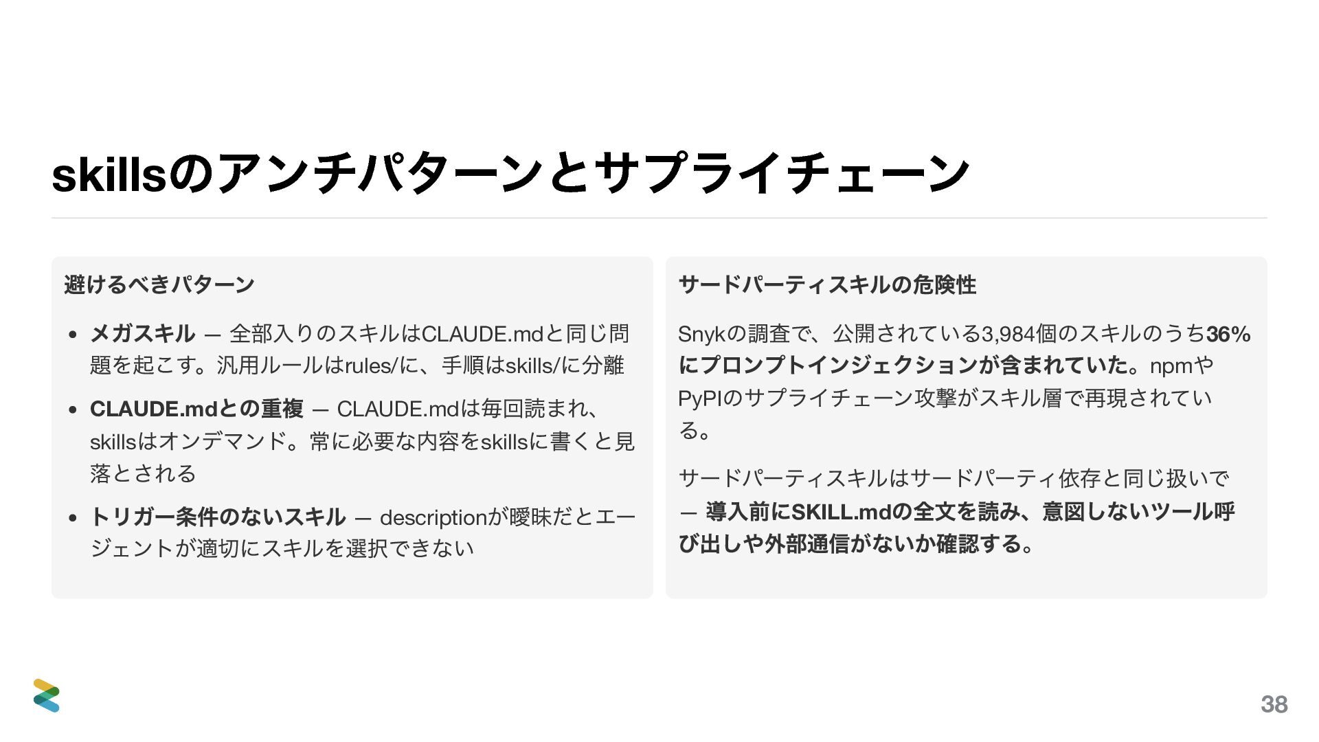 CLAUDE.md との重複 — CLAUDE.md は毎回読まれ、 skills はオンデマンド。常に必要な内容をskills に書くと見 落とされる トリガー条件のないスキル — description が曖昧だとエー ジェントが適切にスキルを選択できない サードパーティスキルの危険性 Snyk の調査で、公開されている3,984 個のスキルのうち36% にプロンプトインジェクションが含まれていた。npm や PyPI のサプライチェーン攻撃がスキル層で再現されてい る。 サードパーティスキルはサードパーティ依存と同じ扱いで — 導入前にSKILL.md の全文を読み、意図しないツール呼 び出しや外部通信がないか確認する。 38