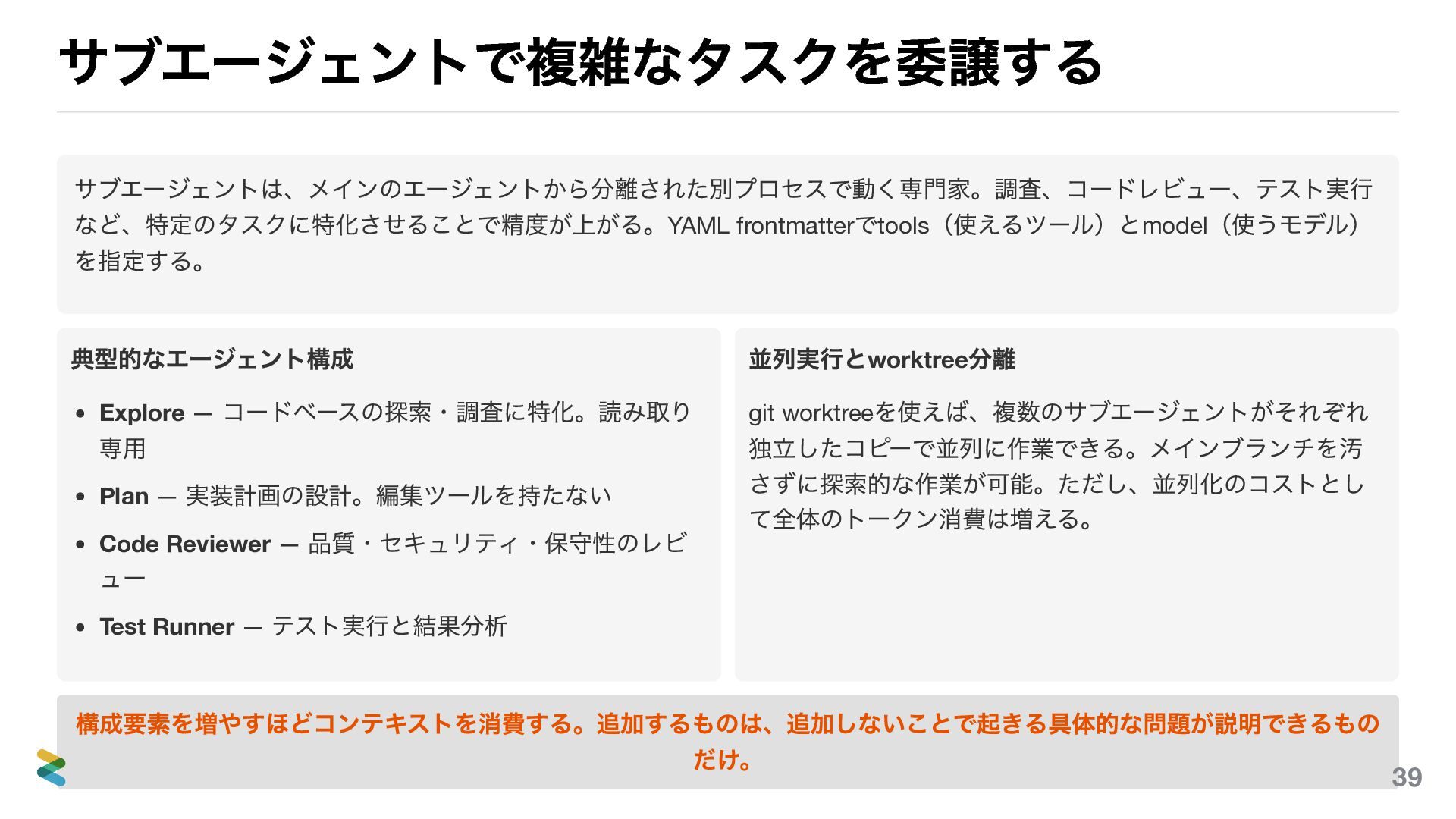 — コードベースの探索・調査に特化。読み取り 専用 Plan — 実装計画の設計。編集ツールを持たない Code Reviewer — 品質・セキュリティ・保守性のレビ ュー Test Runner — テスト実行と結果分析 並列実行とworktree 分離 git worktree を使えば、複数のサブエージェントがそれぞれ 独立したコピーで並列に作業できる。メインブランチを汚 さずに探索的な作業が可能。ただし、並列化のコストとし て全体のトークン消費は増える。 構成要素を増やすほどコンテキストを消費する。追加するものは、追加しないことで起きる具体的な問題が説明できるもの だけ。 39