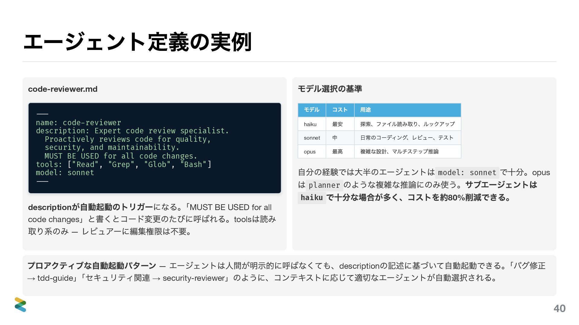 Proactively reviews code for quality, security, and maintainability. MUST BE USED for all code changes. tools: ["Read", "Grep", "Glob", "Bash"] model: sonnet --- description が自動起動のトリガーになる。 「MUST BE USED for all code changes 」と書くとコード変更のたびに呼ばれる。tools は読み 取り系のみ — レビュアーに編集権限は不要。 モデル選択の基準 モデル コスト 用途 haiku 最安 探索、ファイル読み取り、ルックアップ sonnet 中 日常のコーディング、レビュー、テスト opus 最高 複雑な設計、マルチステップ推論 自分の経験では大半のエージェントは model: sonnet で十分。opus は planner のような複雑な推論にのみ使う。サブエージェントは haiku で十分な場合が多く、コストを約80% 削減できる。 プロアクティブな自動起動パターン — エージェントは人間が明示的に呼ばなくても、description の記述に基づいて自動起動できる。 「バグ修正 → tdd-guide 」 「セキュリティ関連 → security-reviewer 」のように、コンテキストに応じて適切なエージェントが自動選択される。 40