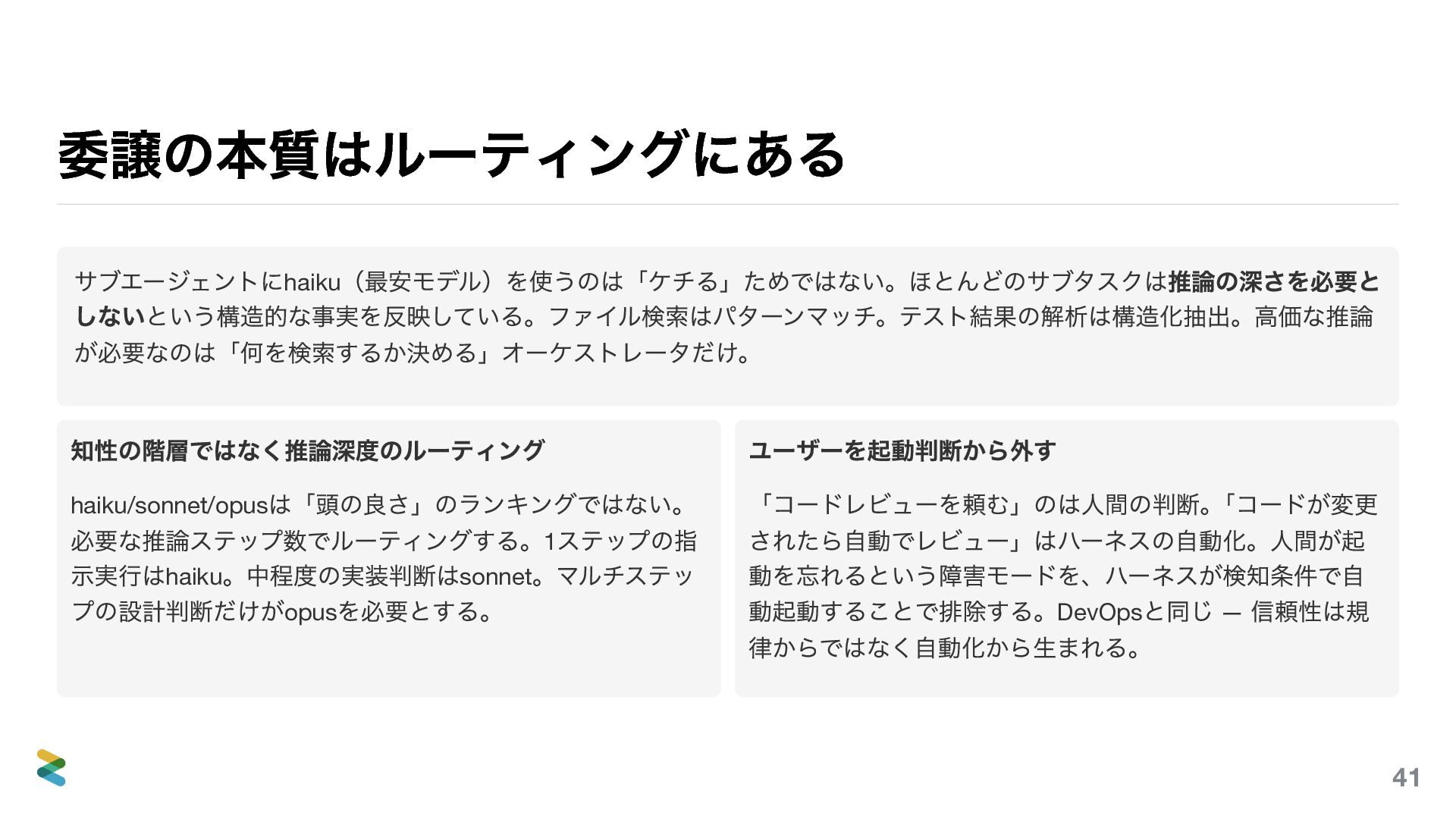 示実行はhaiku 。中程度の実装判断はsonnet 。マルチステッ プの設計判断だけがopus を必要とする。 ユーザーを起動判断から外す 「コードレビューを頼む」のは人間の判断。 「コードが変更 されたら自動でレビュー」はハーネスの自動化。人間が起 動を忘れるという障害モードを、ハーネスが検知条件で自 動起動することで排除する。DevOps と同じ — 信頼性は規 律からではなく自動化から生まれる。 41