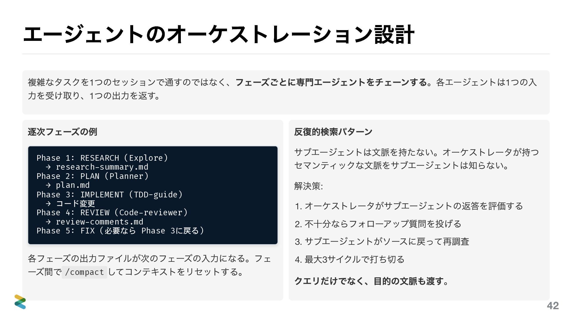 (Explore) → research-summary.md Phase 2: PLAN (Planner) → plan.md Phase 3: IMPLEMENT (TDD-guide) → コード変更 Phase 4: REVIEW (Code-reviewer) → review-comments.md Phase 5: FIX (必要なら Phase 3に戻る) 各フェーズの出力ファイルが次のフェーズの入力になる。フェ ーズ間で /compact してコンテキストをリセットする。 反復的検索パターン サブエージェントは文脈を持たない。オーケストレータが持つ セマンティックな文脈をサブエージェントは知らない。 解決策: 1. オーケストレータがサブエージェントの返答を評価する 2. 不十分ならフォローアップ質問を投げる 3. サブエージェントがソースに戻って再調査 4. 最大3 サイクルで打ち切る クエリだけでなく、目的の文脈も渡す。 42