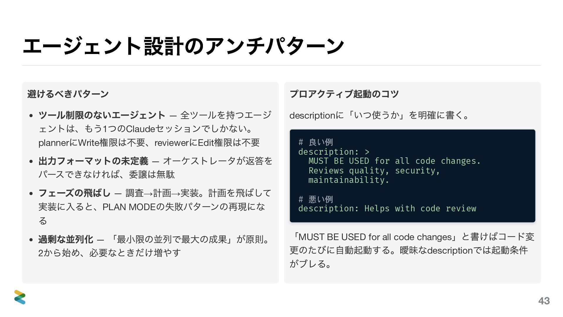 権限は不要、reviewer にEdit 権限は不要 出力フォーマットの未定義 — オーケストレータが返答を パースできなければ、委譲は無駄 フェーズの飛ばし — 調査→ 計画→ 実装。計画を飛ばして 実装に入ると、PLAN MODE の失敗パターンの再現にな る 過剰な並列化 — 「最小限の並列で最大の成果」が原則。 2 から始め、必要なときだけ増やす プロアクティブ起動のコツ description に「いつ使うか」を明確に書く。 # 良い例 description: > MUST BE USED for all code changes. Reviews quality, security, maintainability. # 悪い例 description: Helps with code review 「MUST BE USED for all code changes 」と書けばコード変 更のたびに自動起動する。曖昧なdescription では起動条件 がブレる。 43