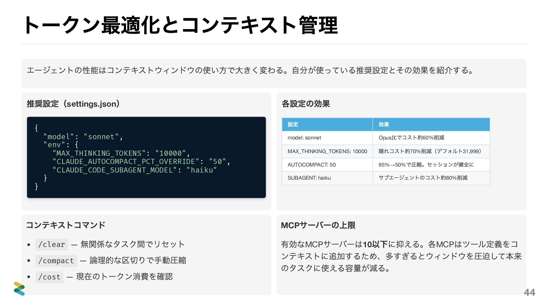 "10000", "CLAUDE_AUTOCOMPACT_PCT_OVERRIDE": "50", "CLAUDE_CODE_SUBAGENT_MODEL": "haiku" } } 各設定の効果 設定 効果 model: sonnet Opus 比でコスト約60% 削減 MAX_THINKING_TOKENS: 10000 隠れコスト約70% 削減(デフォルト31,999 ) AUTOCOMPACT: 50 95%→50% で圧縮。セッションが健全に SUBAGENT: haiku サブエージェントのコスト約80% 削減 コンテキストコマンド /clear — 無関係なタスク間でリセット /compact — 論理的な区切りで手動圧縮 /cost — 現在のトークン消費を確認 MCP サーバーの上限 有効なMCP サーバーは10 以下に抑える。各MCP はツール定義をコ ンテキストに追加するため、多すぎるとウィンドウを圧迫して本来 のタスクに使える容量が減る。 44