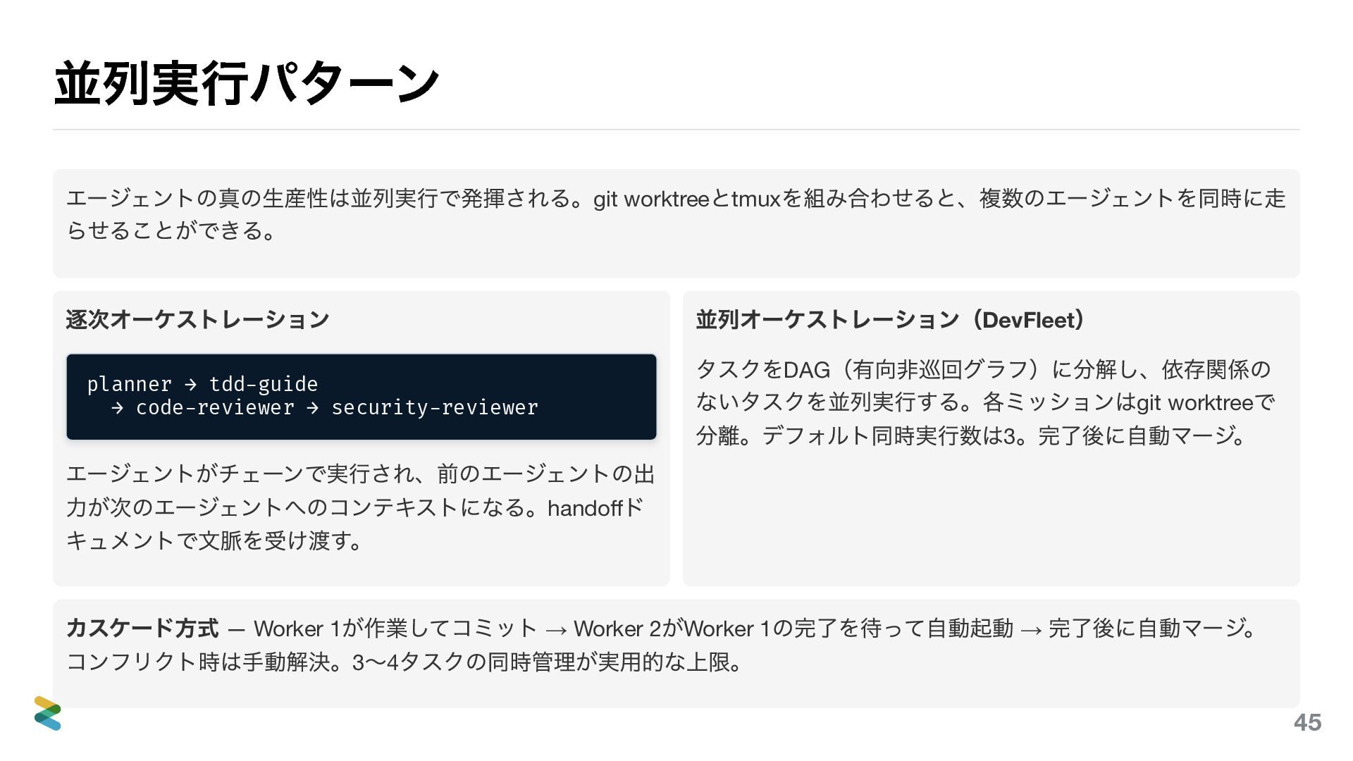 → code-reviewer → security-reviewer エージェントがチェーンで実行され、前のエージェントの出 力が次のエージェントへのコンテキストになる。handoff ド キュメントで文脈を受け渡す。 並列オーケストレーション(DevFleet ) タスクをDAG (有向非巡回グラフ)に分解し、依存関係の ないタスクを並列実行する。各ミッションはgit worktree で 分離。デフォルト同時実行数は3 。完了後に自動マージ。 カスケード方式 — Worker 1 が作業してコミット → Worker 2 がWorker 1 の完了を待って自動起動 → 完了後に自動マージ。 コンフリクト時は手動解決。3 〜4 タスクの同時管理が実用的な上限。 45
