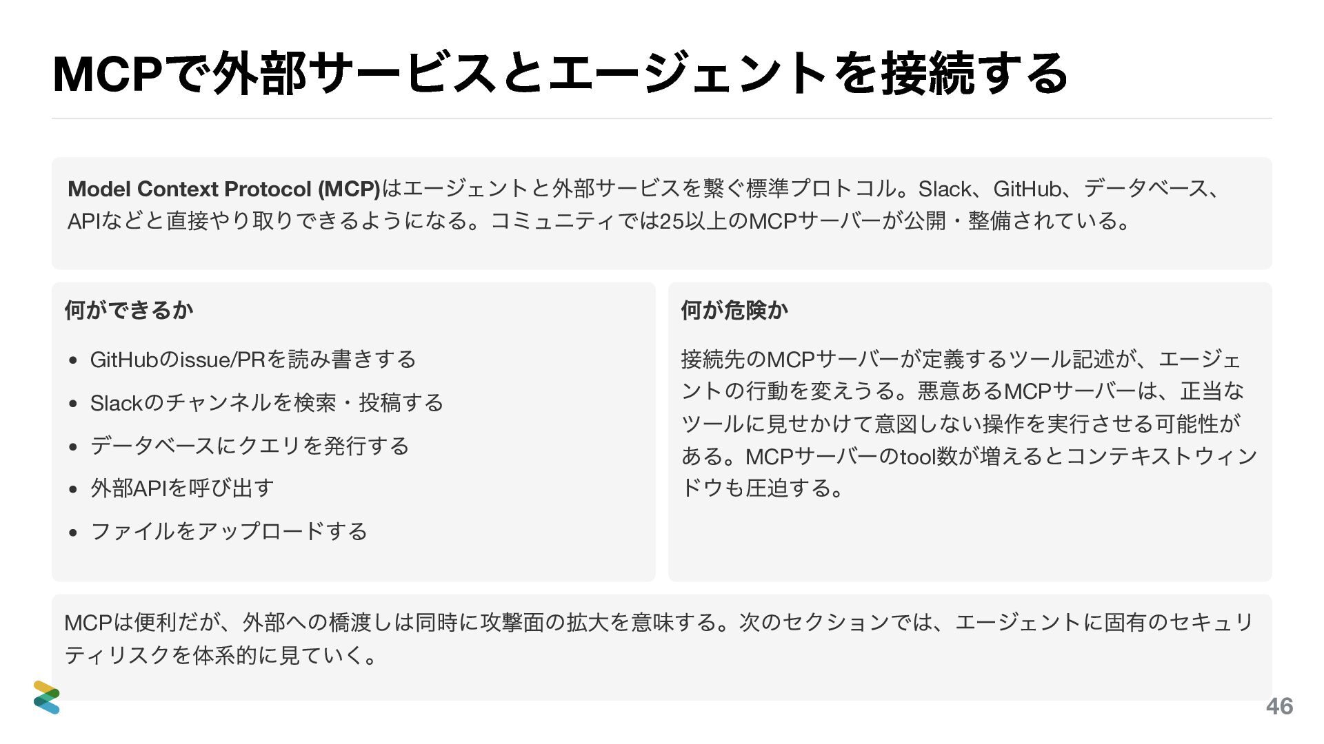 などと直接やり取りできるようになる。コミュニティでは25 以上のMCP サーバーが公開・整備されている。 何ができるか GitHub のissue/PR を読み書きする Slack のチャンネルを検索・投稿する データベースにクエリを発行する 外部API を呼び出す ファイルをアップロードする 何が危険か 接続先のMCP サーバーが定義するツール記述が、エージェ ントの行動を変えうる。悪意あるMCP サーバーは、正当な ツールに見せかけて意図しない操作を実行させる可能性が ある。MCP サーバーのtool 数が増えるとコンテキストウィン ドウも圧迫する。 MCP は便利だが、外部への橋渡しは同時に攻撃面の拡大を意味する。次のセクションでは、エージェントに固有のセキュリ ティリスクを体系的に見ていく。 46