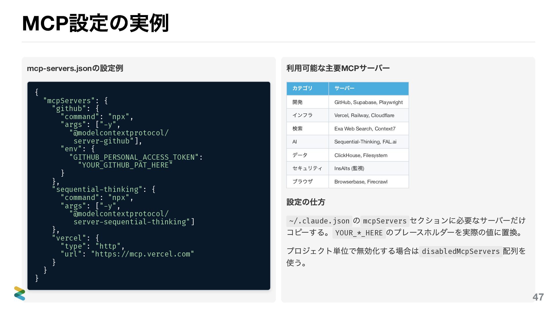 "npx", "args": ["-y", "@modelcontextprotocol/ server-github"], "env": { "GITHUB_PERSONAL_ACCESS_TOKEN": "YOUR_GITHUB_PAT_HERE" } }, "sequential-thinking": { "command": "npx", "args": ["-y", "@modelcontextprotocol/ server-sequential-thinking"] }, "vercel": { "type": "http", "url": "https://mcp.vercel.com" } } } 利用可能な主要MCP サーバー カテゴリ サーバー 開発 GitHub, Supabase, Playwright インフラ Vercel, Railway, Cloudflare 検索 Exa Web Search, Context7 AI Sequential-Thinking, FAL.ai データ ClickHouse, Filesystem セキュリティ InsAIts ( 監視) ブラウザ Browserbase, Firecrawl 設定の仕方 ~/.claude.json の mcpServers セクションに必要なサーバーだけ コピーする。 YOUR_*_HERE のプレースホルダーを実際の値に置換。 プロジェクト単位で無効化する場合は disabledMcpServers 配列を 使う。 47