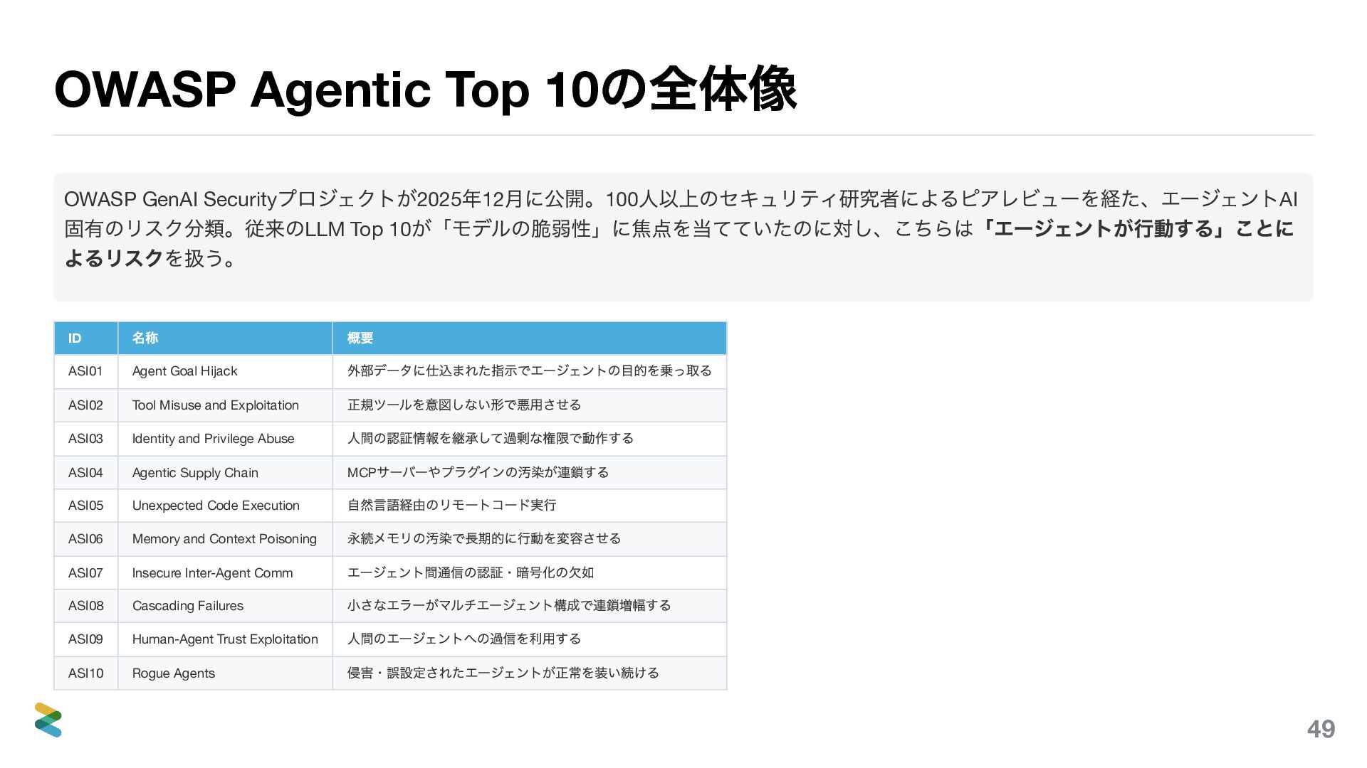 月に公開。100 人以上のセキュリティ研究者によるピアレビューを経た、エージェントAI 固有のリスク分類。従来のLLM Top 10 が「モデルの脆弱性」に焦点を当てていたのに対し、こちらは「エージェントが行動する」ことに よるリスクを扱う。 ID 名称 概要 ASI01 Agent Goal Hijack 外部データに仕込まれた指示でエージェントの目的を乗っ取る ASI02 Tool Misuse and Exploitation 正規ツールを意図しない形で悪用させる ASI03 Identity and Privilege Abuse 人間の認証情報を継承して過剰な権限で動作する ASI04 Agentic Supply Chain MCP サーバーやプラグインの汚染が連鎖する ASI05 Unexpected Code Execution 自然言語経由のリモートコード実行 ASI06 Memory and Context Poisoning 永続メモリの汚染で長期的に行動を変容させる ASI07 Insecure Inter-Agent Comm エージェント間通信の認証・暗号化の欠如 ASI08 Cascading Failures 小さなエラーがマルチエージェント構成で連鎖増幅する ASI09 Human-Agent Trust Exploitation 人間のエージェントへの過信を利用する ASI10 Rogue Agents 侵害・誤設定されたエージェントが正常を装い続ける 49