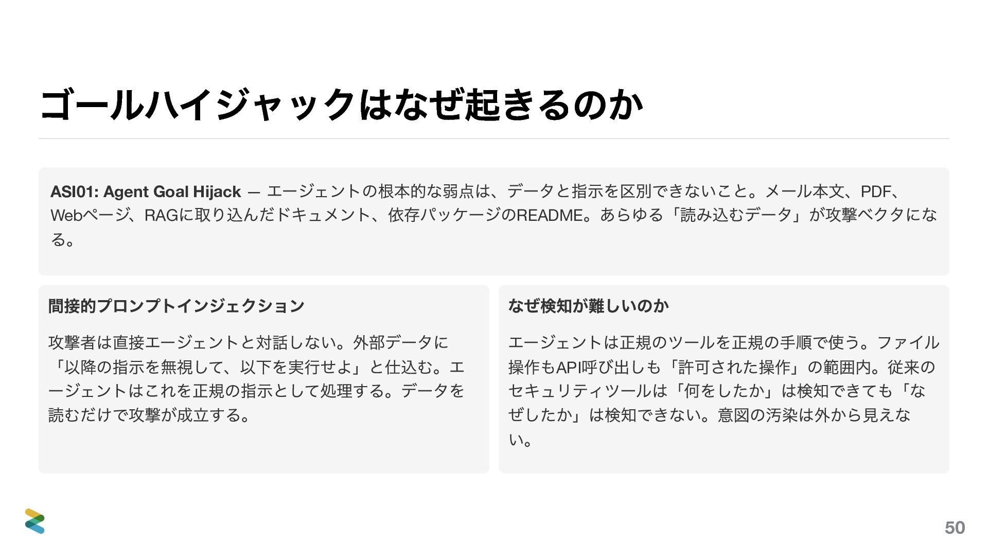 に取り込んだドキュメント、依存パッケージのREADME 。あらゆる「読み込むデータ」が攻撃ベクタにな る。 間接的プロンプトインジェクション 攻撃者は直接エージェントと対話しない。外部データに 「以降の指示を無視して、以下を実行せよ」と仕込む。エ ージェントはこれを正規の指示として処理する。データを 読むだけで攻撃が成立する。 なぜ検知が難しいのか エージェントは正規のツールを正規の手順で使う。ファイル 操作もAPI 呼び出しも「許可された操作」の範囲内。従来の セキュリティツールは「何をしたか」は検知できても「な ぜしたか」は検知できない。意図の汚染は外から見えな い。 50