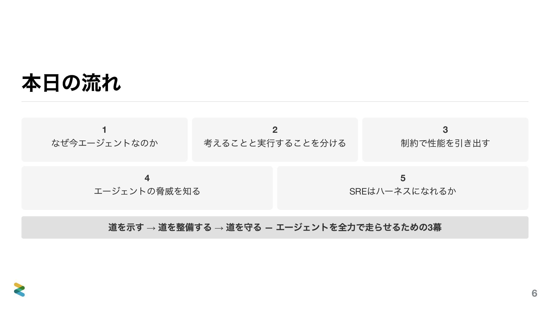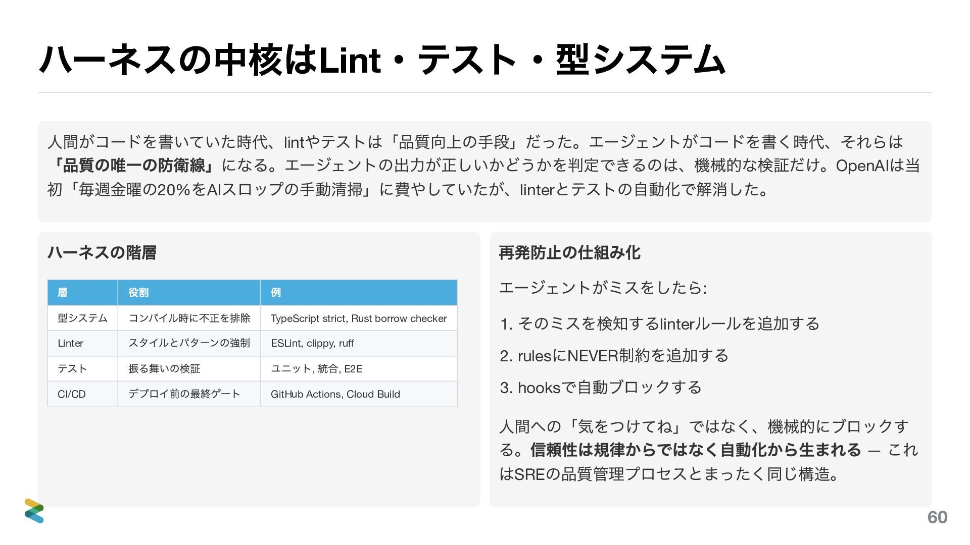 ハーネスの階層 層 役割 例 型システム コンパイル時に不正を排除 TypeScript strict, Rust borrow checker Linter スタイルとパターンの強制 ESLint, clippy, ruff テスト 振る舞いの検証 ユニット, 統合, E2E CI/CD デプロイ前の最終ゲート GitHub Actions, Cloud Build 再発防止の仕組み化 エージェントがミスをしたら: 1. そのミスを検知するlinter ルールを追加する 2. rules にNEVER 制約を追加する 3. hooks で自動ブロックする 人間への「気をつけてね」ではなく、機械的にブロックす る。信頼性は規律からではなく自動化から生まれる — これ はSRE の品質管理プロセスとまったく同じ構造。 60