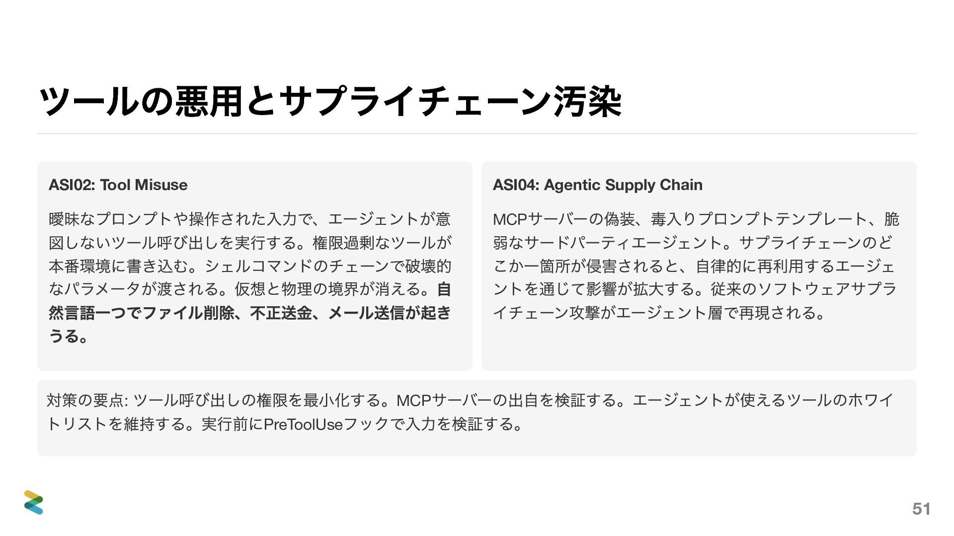 ASI04: Agentic Supply Chain MCP サーバーの偽装、毒入りプロンプトテンプレート、脆 弱なサードパーティエージェント。サプライチェーンのど こか一箇所が侵害されると、自律的に再利用するエージェ ントを通じて影響が拡大する。従来のソフトウェアサプラ イチェーン攻撃がエージェント層で再現される。 対策の要点: ツール呼び出しの権限を最小化する。MCP サーバーの出自を検証する。エージェントが使えるツールのホワイ トリストを維持する。実行前にPreToolUse フックで入力を検証する。 51