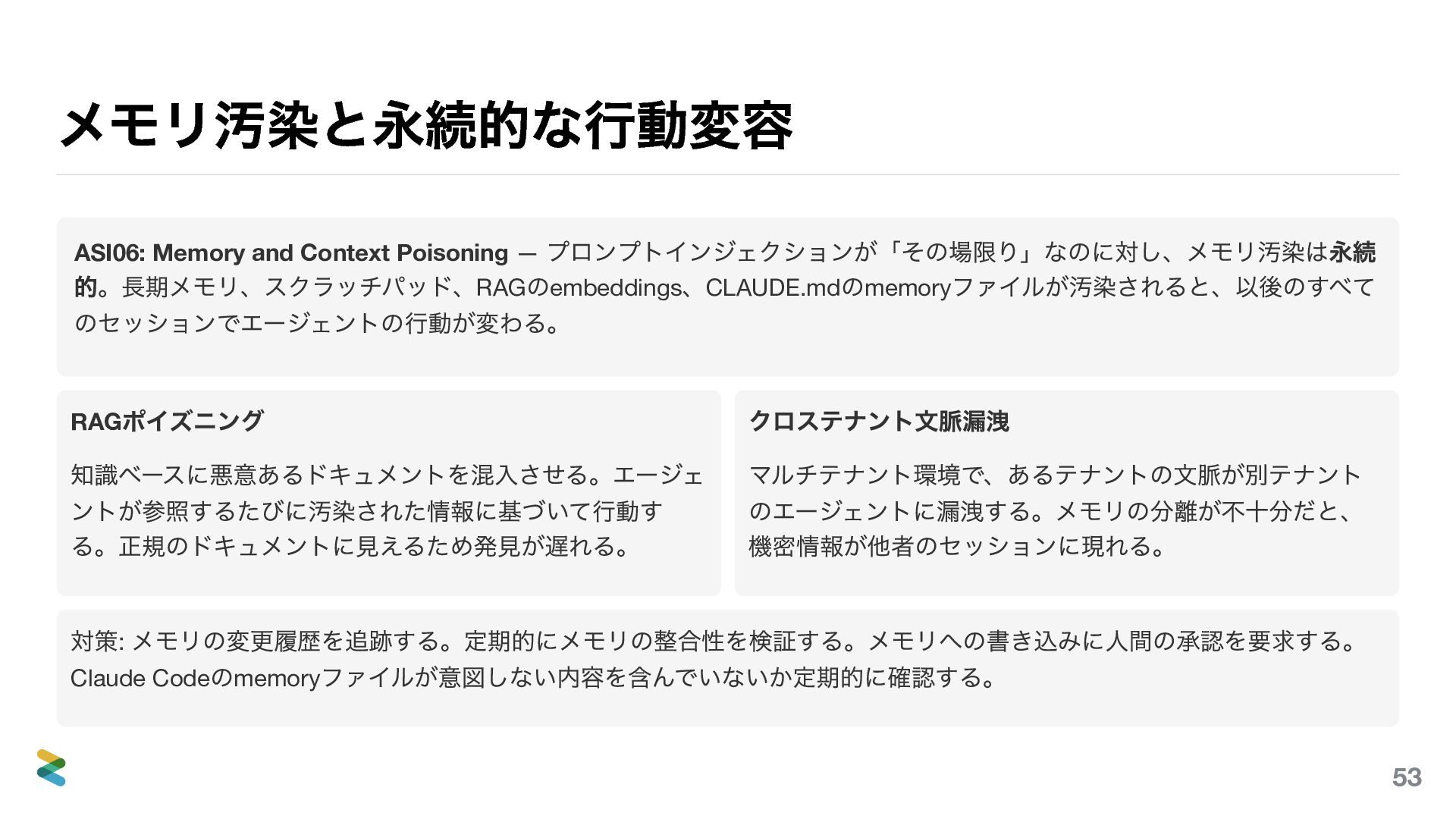 、CLAUDE.md のmemory ファイルが汚染されると、以後のすべて のセッションでエージェントの行動が変わる。 RAG ポイズニング 知識ベースに悪意あるドキュメントを混入させる。エージェ ントが参照するたびに汚染された情報に基づいて行動す る。正規のドキュメントに見えるため発見が遅れる。 クロステナント文脈漏洩 マルチテナント環境で、あるテナントの文脈が別テナント のエージェントに漏洩する。メモリの分離が不十分だと、 機密情報が他者のセッションに現れる。 対策: メモリの変更履歴を追跡する。定期的にメモリの整合性を検証する。メモリへの書き込みに人間の承認を要求する。 Claude Code のmemory ファイルが意図しない内容を含んでいないか定期的に確認する。 53