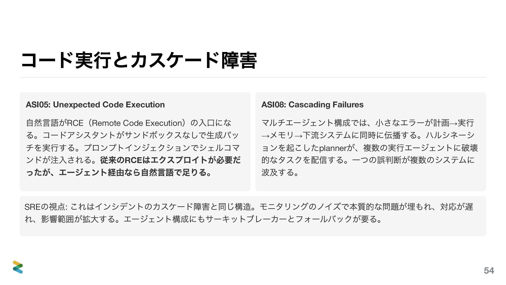る。コードアシスタントがサンドボックスなしで生成パッ チを実行する。プロンプトインジェクションでシェルコマ ンドが注入される。従来のRCE はエクスプロイトが必要だ ったが、エージェント経由なら自然言語で足りる。 ASI08: Cascading Failures マルチエージェント構成では、小さなエラーが計画→ 実行 → メモリ→ 下流システムに同時に伝播する。ハルシネーシ ョンを起こしたplanner が、複数の実行エージェントに破壊 的なタスクを配信する。一つの誤判断が複数のシステムに 波及する。 SRE の視点: これはインシデントのカスケード障害と同じ構造。モニタリングのノイズで本質的な問題が埋もれ、対応が遅 れ、影響範囲が拡大する。エージェント構成にもサーキットブレーカーとフォールバックが要る。 54